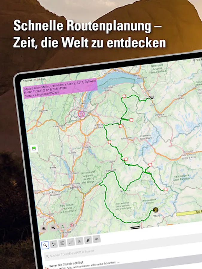 Using integrated, powerful search functions, you don't have to search long for addresses, waypoints, routes, TOURENFAHRER tours and tracks, but can start planning or driving straight away.