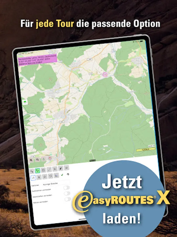 Share your location with other easyROUTES X users via our internal easyROUTES X network and see where your fellow travelers are at all times. Waypoints, routes and tracks can also be passed on via WLAN, Airdrop, e-mail or messenger. A simple data transfer to easyROUTES X Desktop is also included.