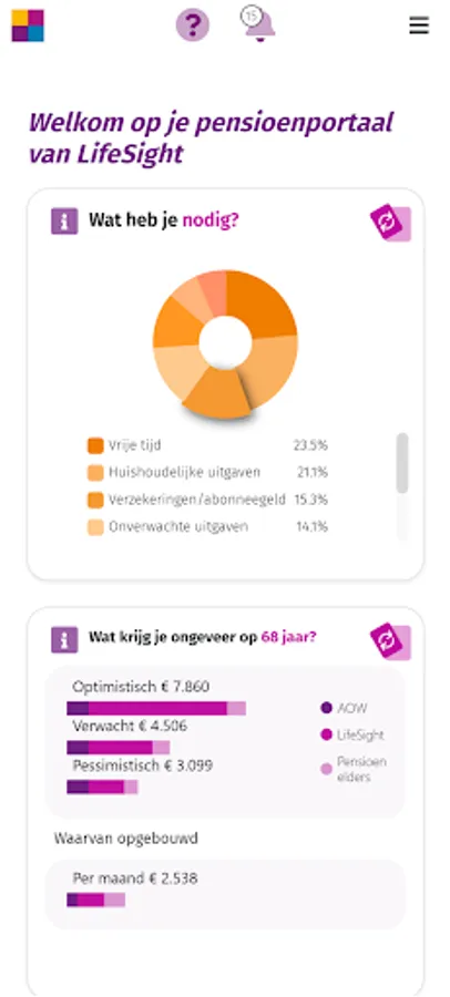 • Easy insight into your expected pension payment on your retirement date and what part of this you have already accrued, including your AOW and pensions that you have not accrued with LifeSight.