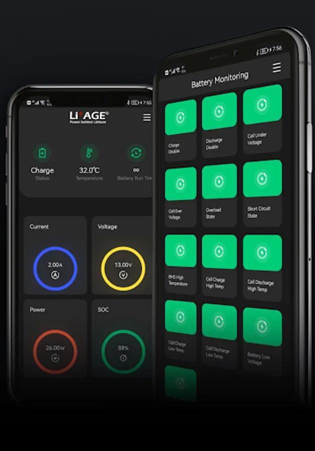 LiAGE App is designed to work with LiAGE Bluetooth batteries to realize 24 hours real-time monitoring. Users can monitor their LiAGE Bluetooth battery voltage, current, state of charge (SOC), power, cell voltage, temperature, cycles, battery run time and various protection status. The App could record every protection status into log so long as it is connected with your Bluetooth battery.