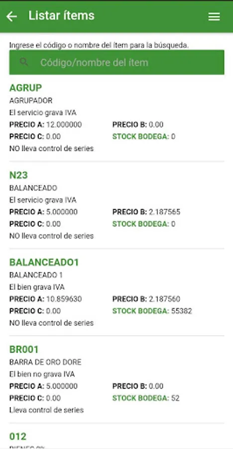 - List items with their main characteristics and available stock.