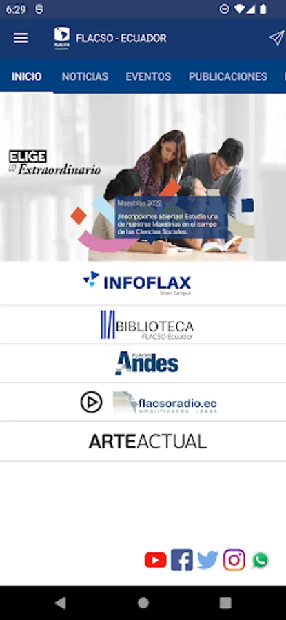 FLACSO Ecuador offers the management of qualifications for teachers and students as well as the management of its staff from the FLACSO APP. Additionally, it keeps informed about its news, events and publications at the moment it occurs.