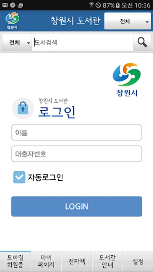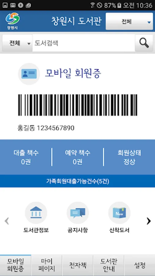 - Book Search library of Changwon, mobile membership card, library guides, e-books, you can access features such as loan lookup and smoke.