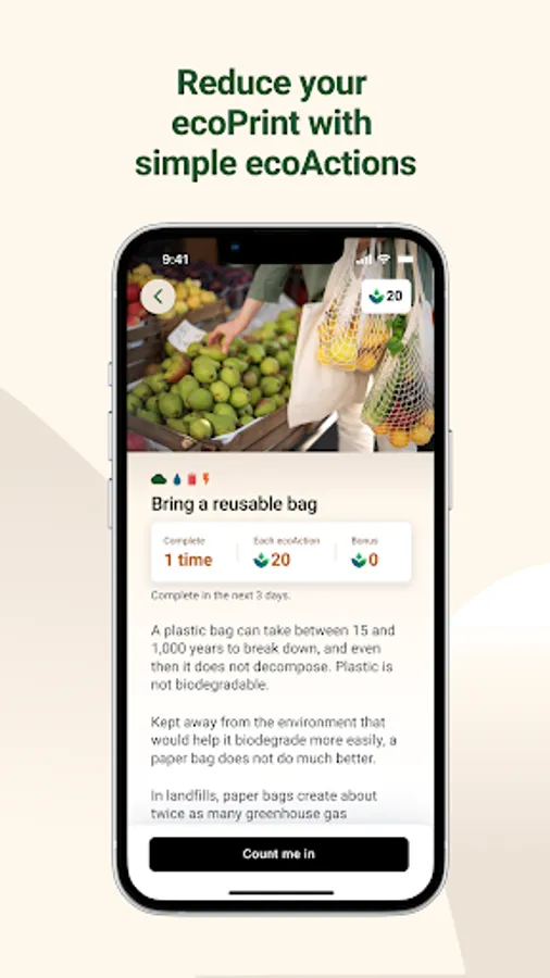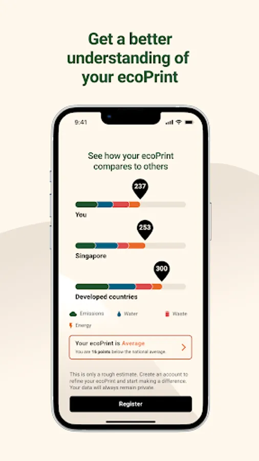 Understand your environmental footprint. ecoPrint breaks it down into carbon footprint, water footprint, energy footprint and waste footprint, providing a more comprehensive picture of your impact on the environment.