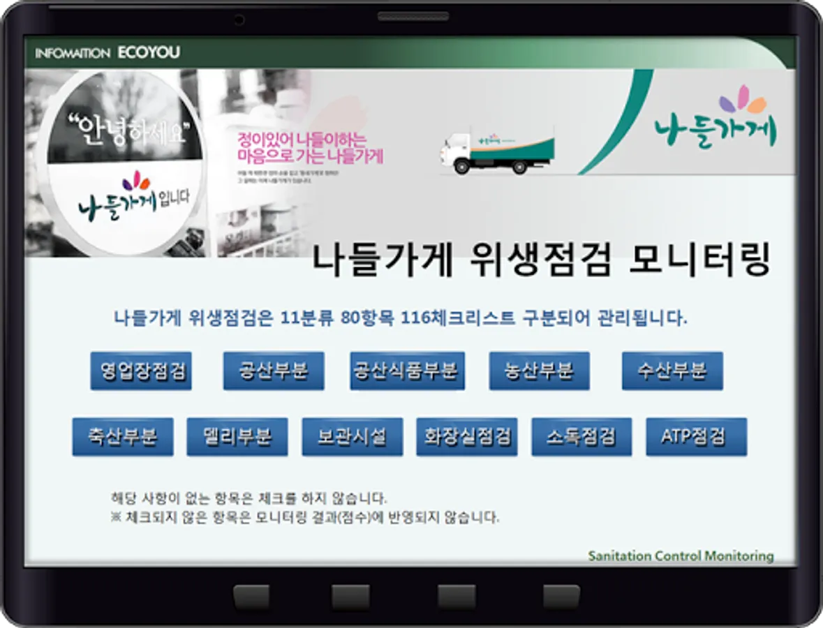 - 위생점검 모니터링 시스템은 나들가게와 마트의 위생관리에 최적화된 사항들을 위생점검 항목으로 만들었습니다.