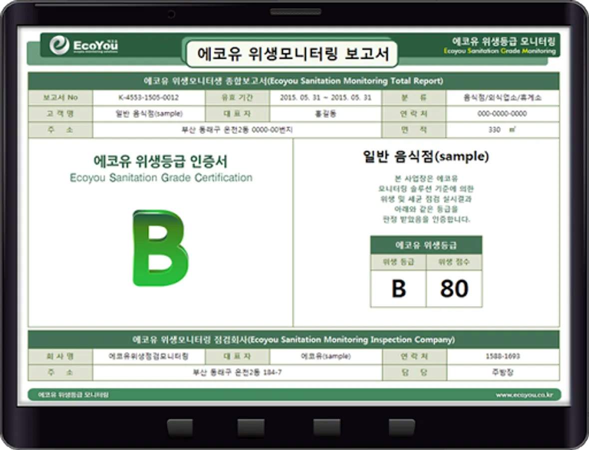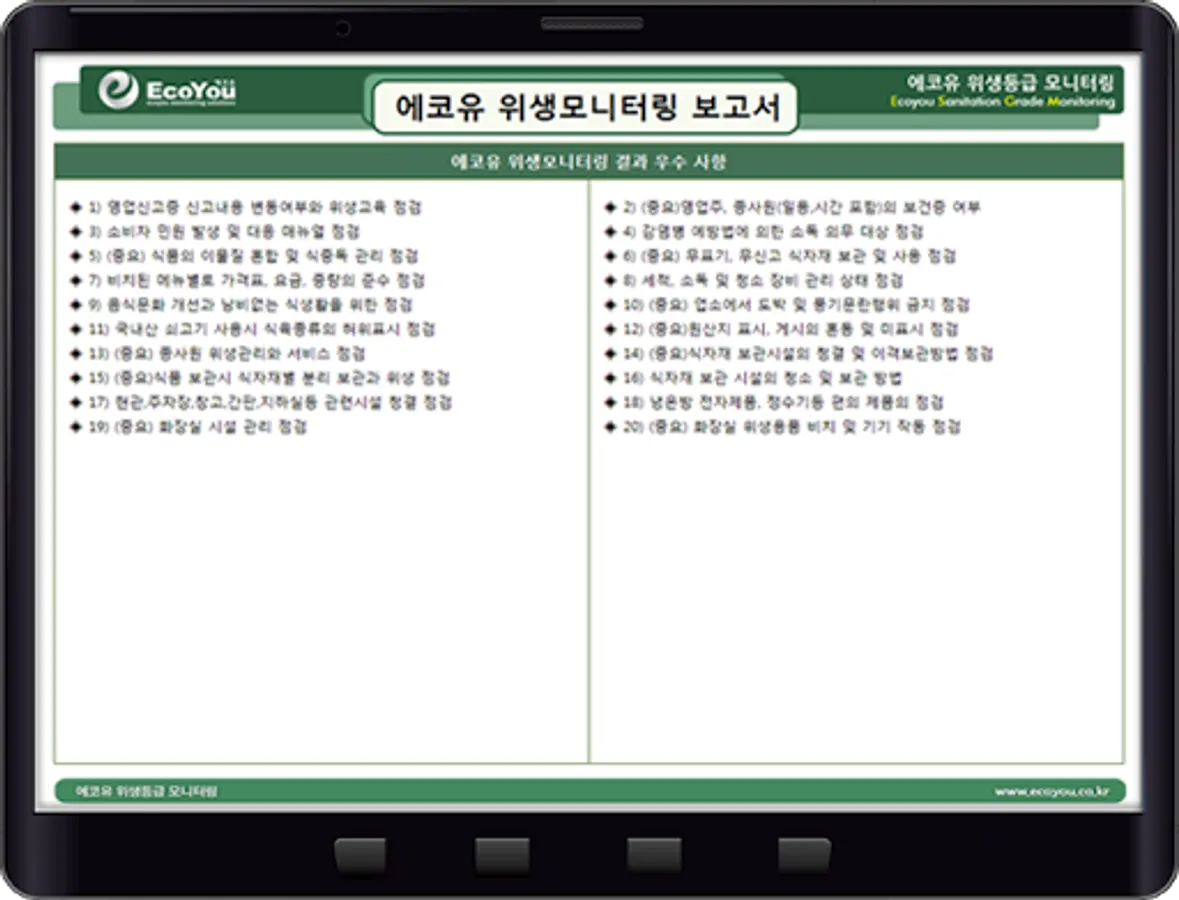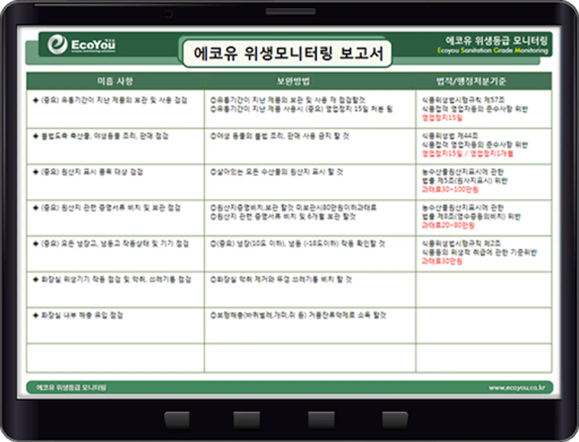 보고서 제공 내용 = 위생점수, 위생등급, 문제점, 법규위반사항, 보완사항,