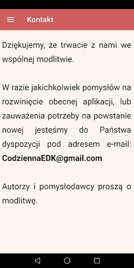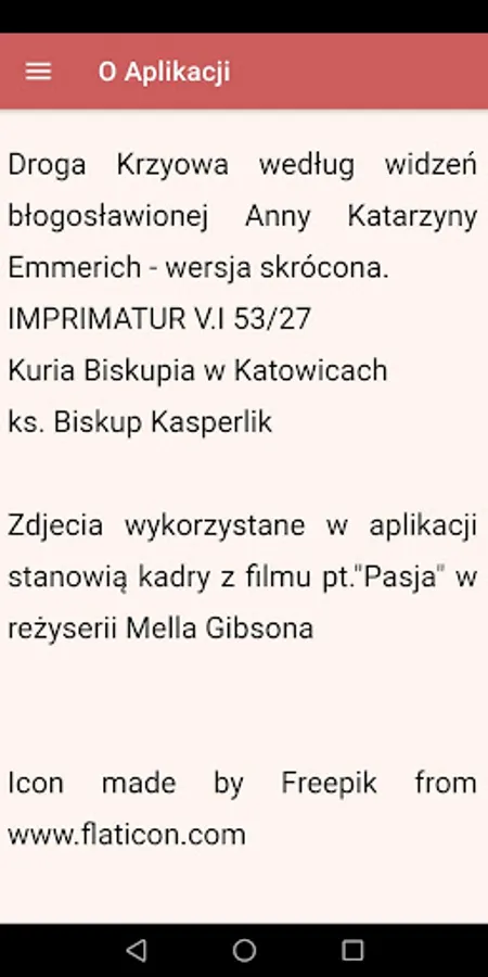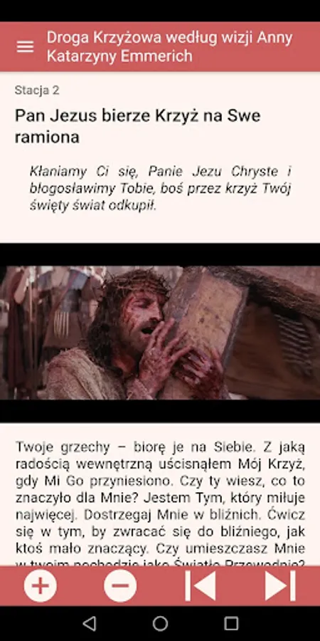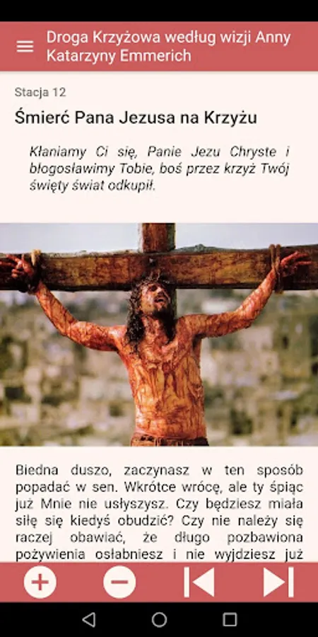 The Way of the Cross according to the vision of Anna Katarzyna Emmerich - short version. The application displays the daily station with a description and interpretation of the blessed Anna Katarzyna Emmerich. Each user is in the same station, so we can all join in a common prayer.