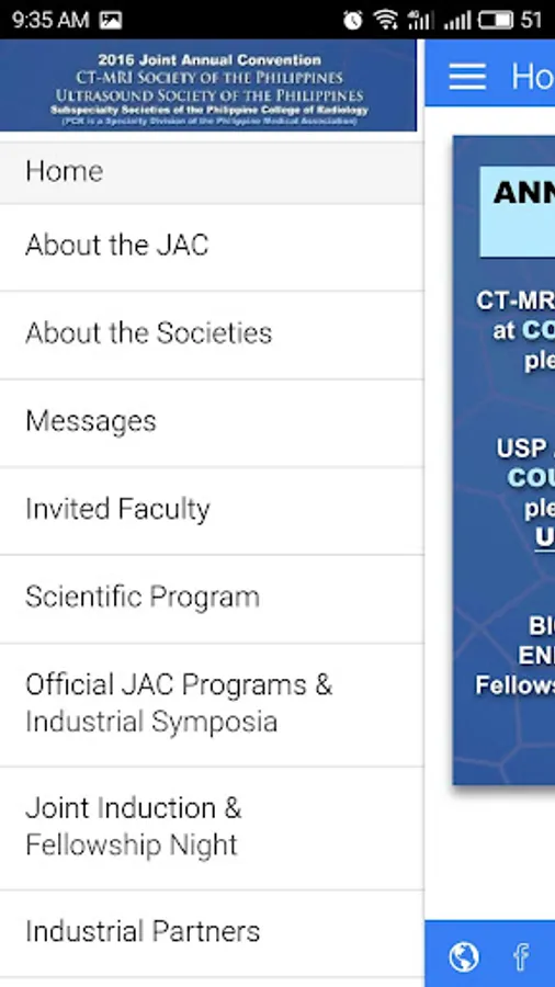 This mobile application is designed to guide participants of the Joint Annual Convention (JAC) of Computed Tomography and Magnetic Resonance Imaging Society of the Philippines (CTMRISP) and Ultrasound Society of the Philippines (USP). This year's theme: "Radiology STAT: Current Practices in Critical Care Imaging"