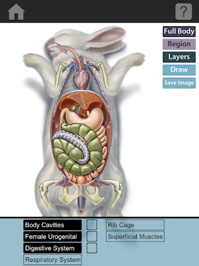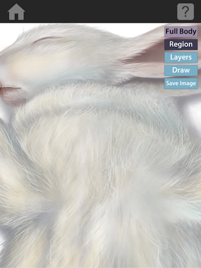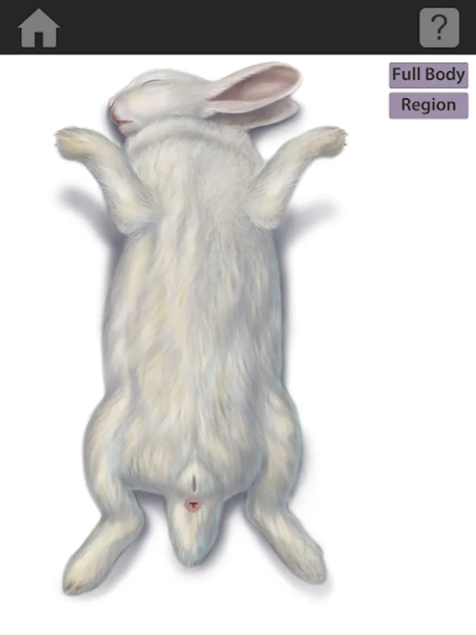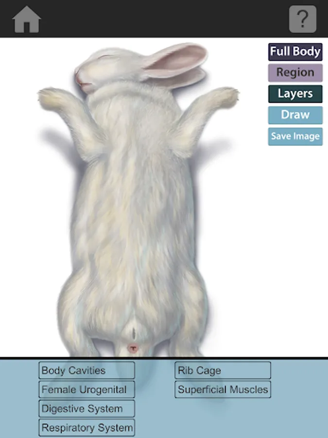 This app allows users to view different aspects of the bunny's anatomy to fit their needs. It is especially useful for a surgeon to show clients where and they might be working by turning on particular layers of the bunny's anatomy. Along with showing different views of the anatomy, this app also allows the user to draw on top of the image. This feature can aid the user in circling certain parts of the anatomy, or writing text. There is also a save image feature that allows the user to save views to their device, which can be sent via email or text at a later date. These images are saved in a folder called The Visible Bunny in the Android pictures folder.