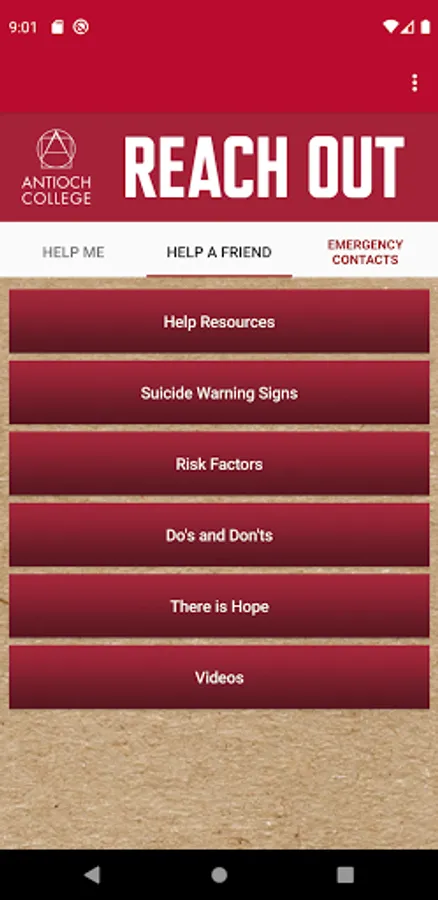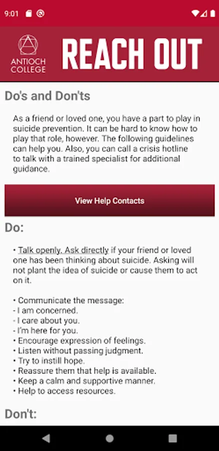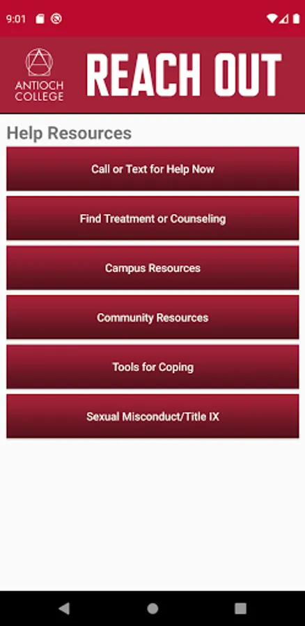 Antioch College's Reach Out app provides quick access to guidance for supporting a friend in need, suicide prevention, or coping with mental health challenges. It also supplies information about resources, referrals, and counseling services offered on the campus and in the community, including crisis hotline numbers. The Reach Out app is designed for students, parents, friends of students, faculty, and staff of Antioch College, located in Yellow Springs, Greene County, Ohio. The Reach Out app better prepares people to help a friend, loved one or themselves.