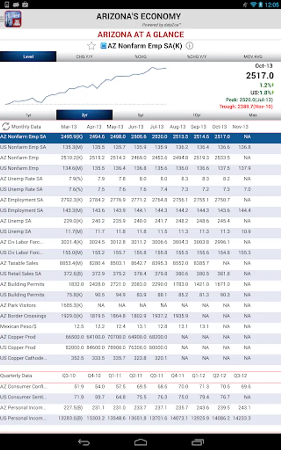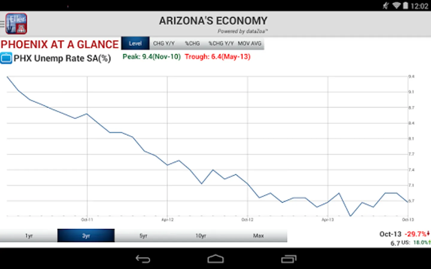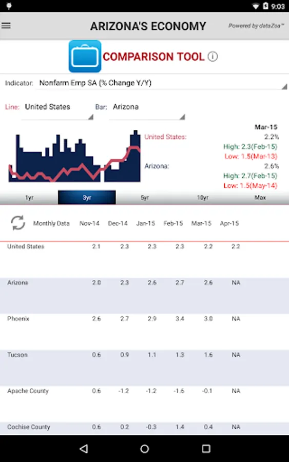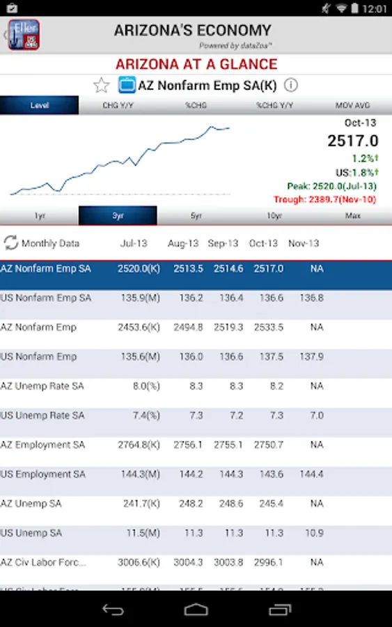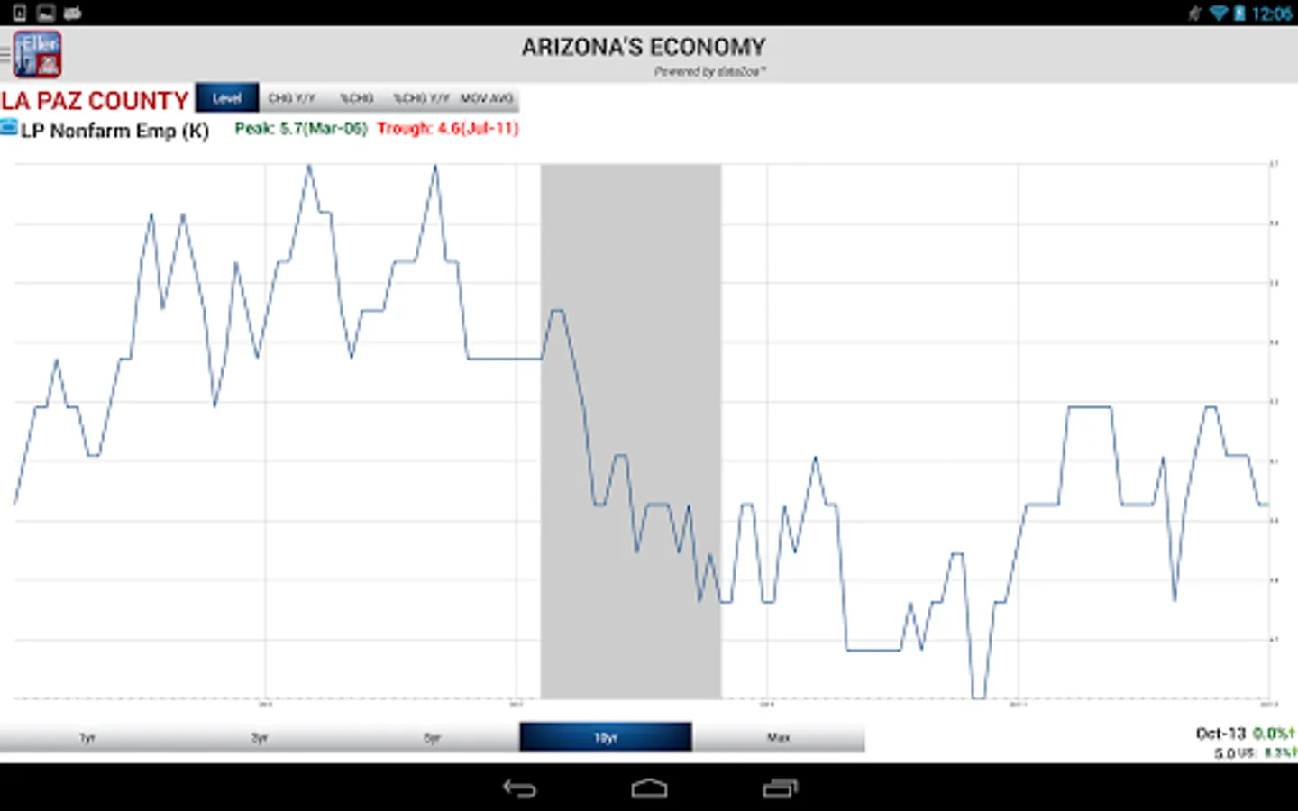 Put the latest economic data for Arizona at your fingertips! Access important metrics such as employment growth, retail sales, population, and personal income for Arizona, its counties, and metro areas. Analyze trends, compute percent changes and moving averages across multiple time horizons. Use the Comparison Tool to track how your city or county performs relative to Arizona and the U.S. Quickly share charts and data with colleagues via email or social media. Keep up-to-date with our statewide and local economies from your smartphone or tablet with the Arizona’s Economy smartphone app!