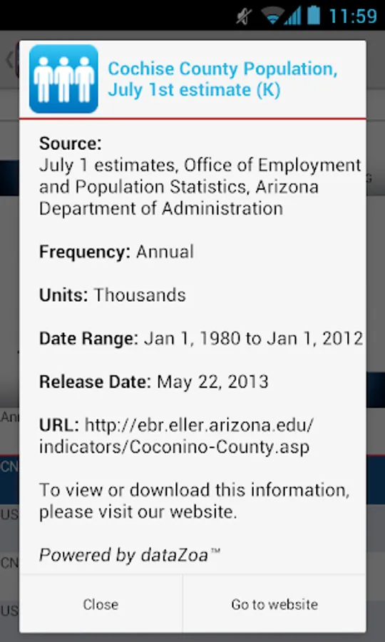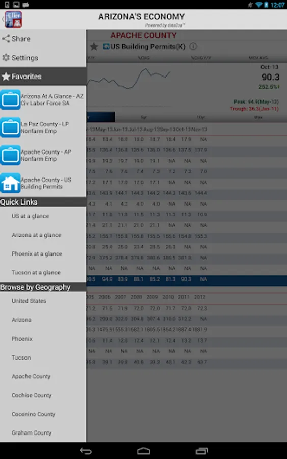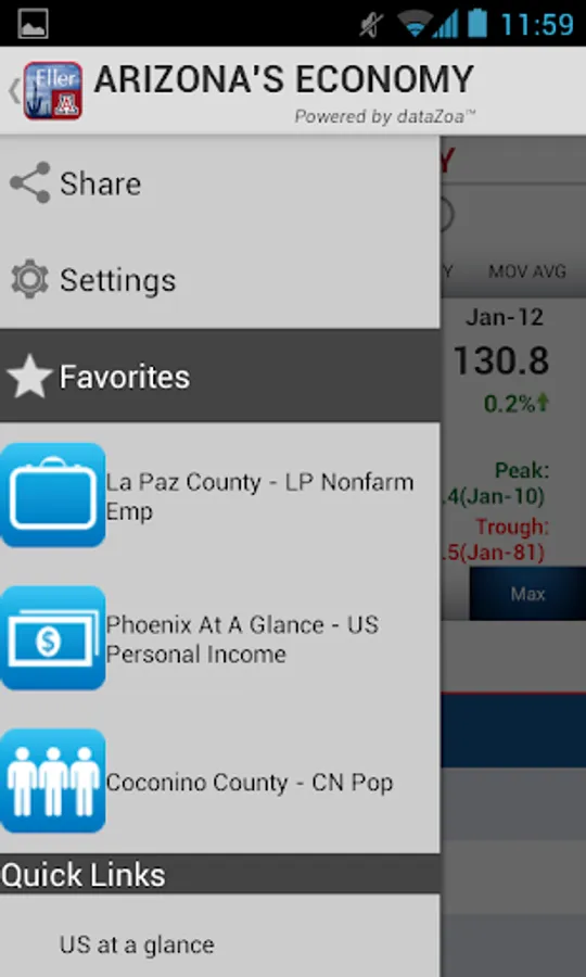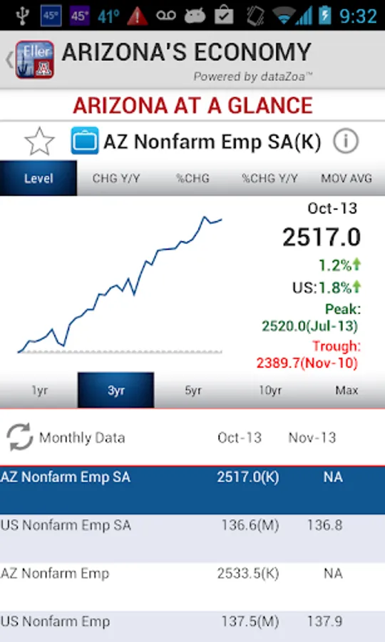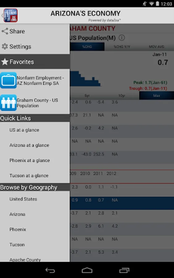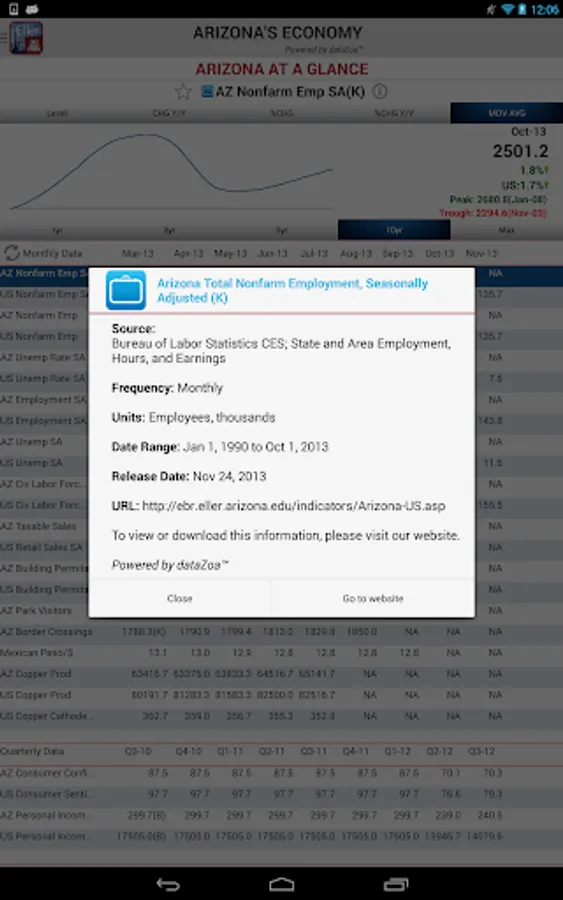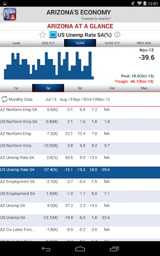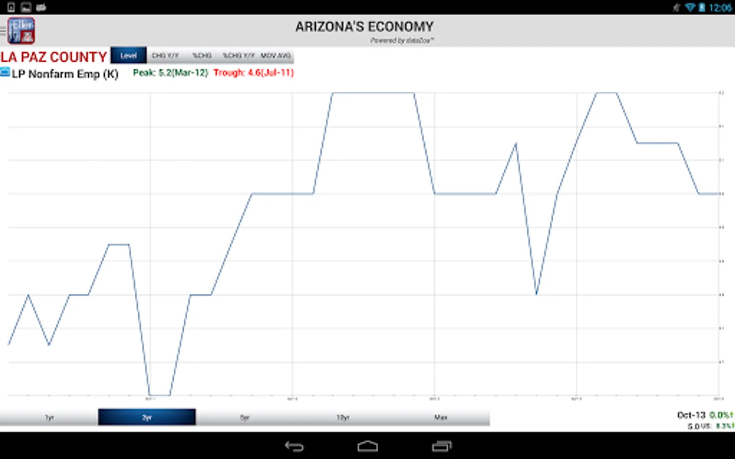 Put the latest economic data for Arizona at your fingertips! Access important metrics such as employment growth, retail sales, population, and personal income for Arizona, its counties, and metro areas. Analyze trends, compute percent changes and moving averages across multiple time horizons. Use the Comparison Tool to track how your city or county performs relative to Arizona and the U.S. Quickly share charts and data with colleagues via email or social media. Keep up-to-date with our statewide and local economies from your smartphone or tablet with the Arizona’s Economy smartphone app!