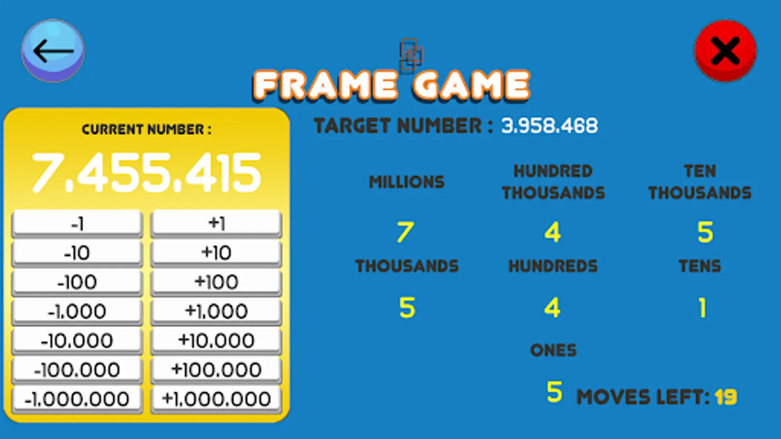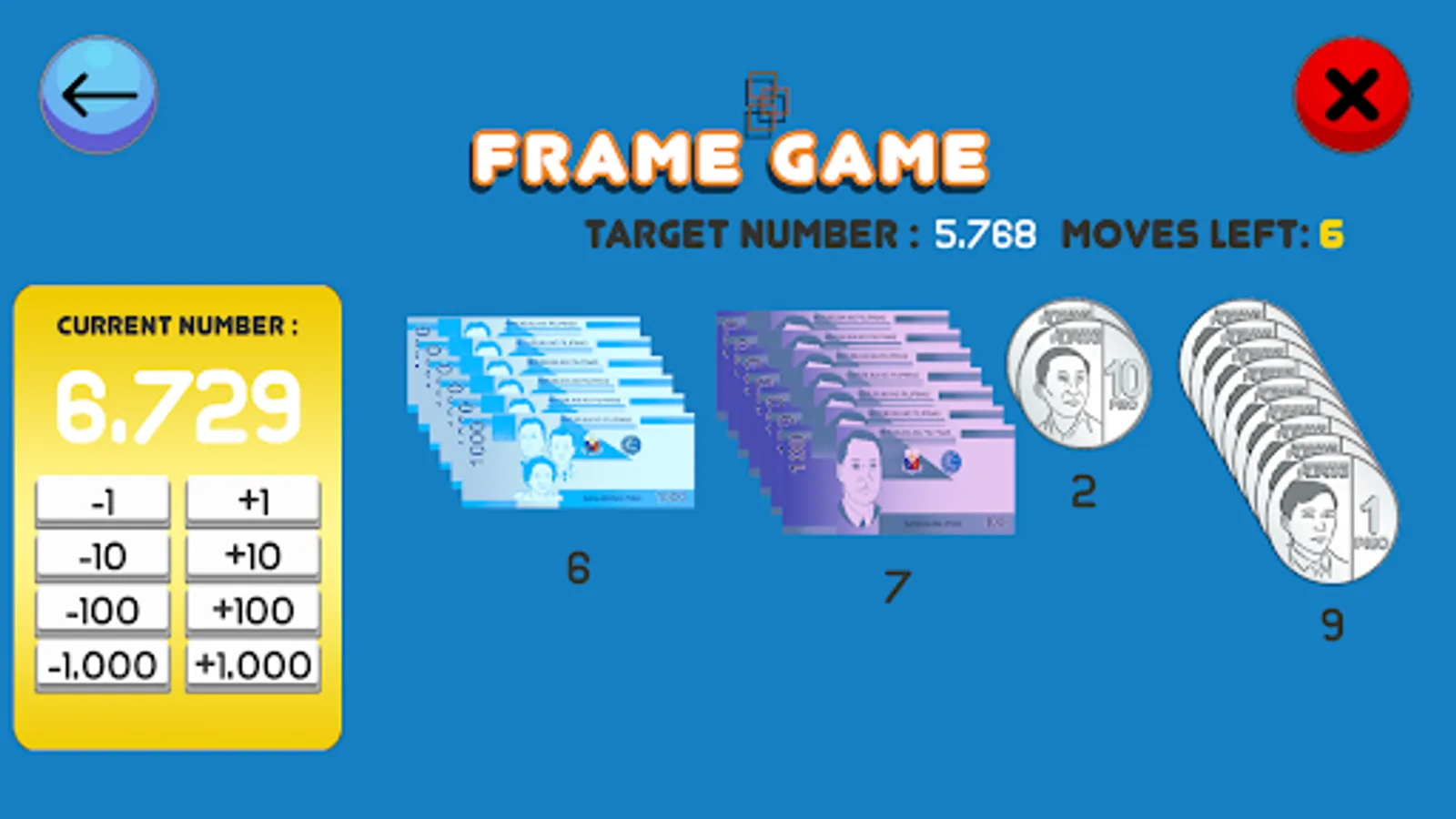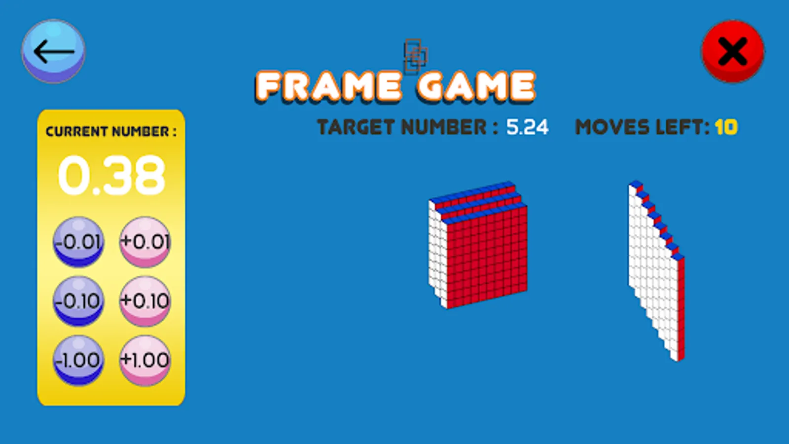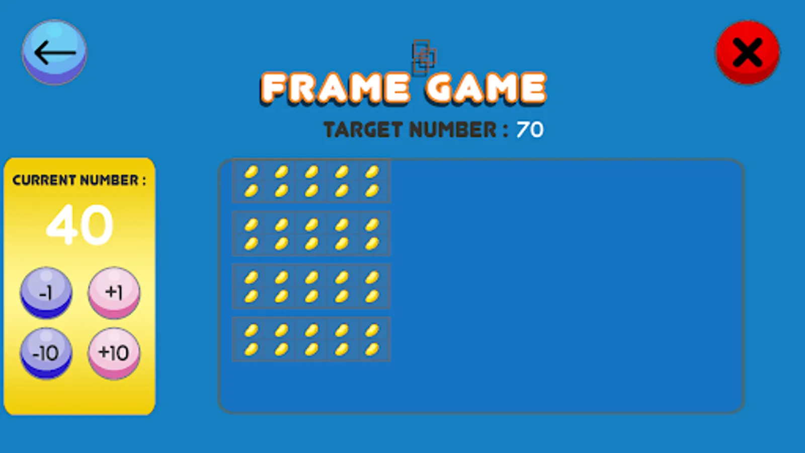 A game about using addition and subtraction to reach the target number. Said number is shown, and the user has to click the buttons (e.g., +1, -1, +10, -10) in order to reach it. At a more advanced level, the user has to complete the task in the shortest or most efficient way possible.