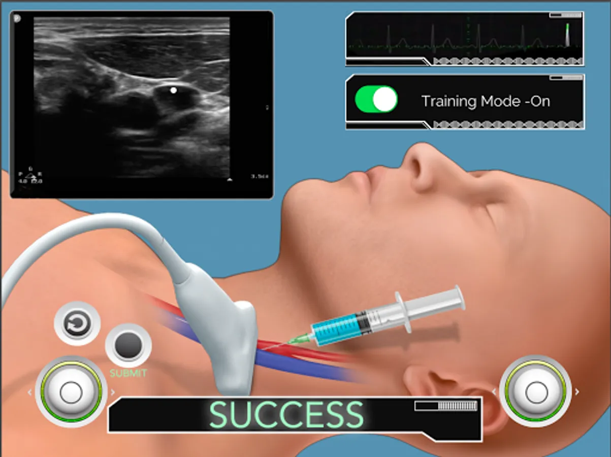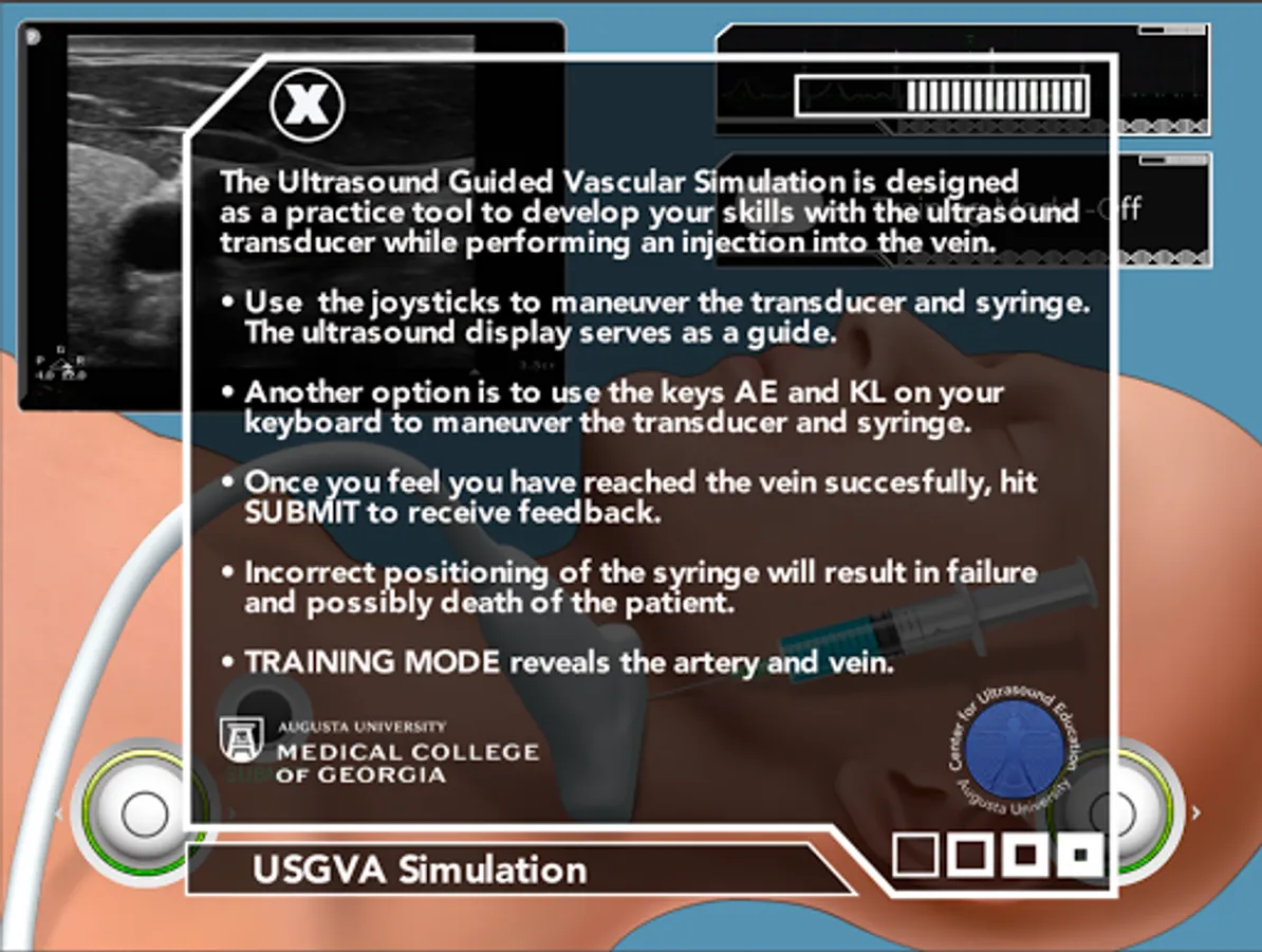 Ultrasound guided vascular access requires both the skill to manipulate the transducer to obtain the appropriate image of the target vein as well as the skill to manipulate the needle to the vein. This game is designed to develop both of these skills, helping the player understand the incremental step wise approach needed to safely place a needle into a vein using ultrasound.