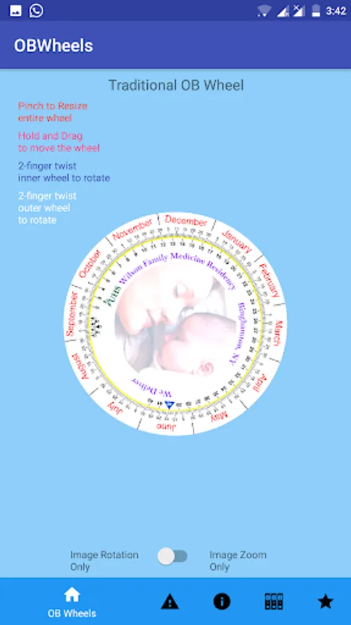 Then for all of you who miss your cardboard OB wheel, the app contains one which you can rotate, pinch and zoom, and generally play with just like a regular cardboard wheel. It's a little tricky to learn how to plant two fingers and rotate them rather than pinch-and-zoom to get rotation versus resizing. But the wheel works and it is accurate, especially so because you can zoom in to be sure where the little date hash lines lie.