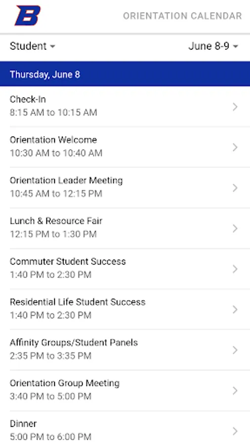 Boise State's Orientation mobile app is designed to help students and families navigate the orientation process. The app features a calendar with all the important orientation events, so students and their families can plan their schedule accordingly. By providing a centralized location for all orientation information, the app makes the orientation process smoother and more efficient for everyone involved.
