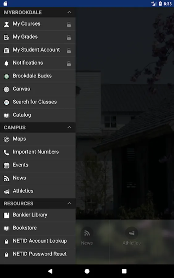 Go to "News" and "Events" for the latest information at Brookdale. View "My Grades", "My Courses", and "Student Finance" as you can in WebAdivsor. Receive notifications on your mobile device to view important messages from Brookdale Administration. View "Campus Maps" and get directions. "Important Numbers" shows the list of important phone numbers and contacts at Brookdale. Access to campus resources such as the library, Brookdale Bucks, Canvas, and password management.