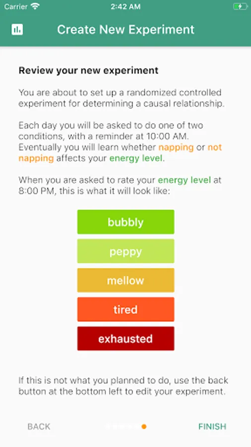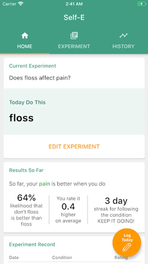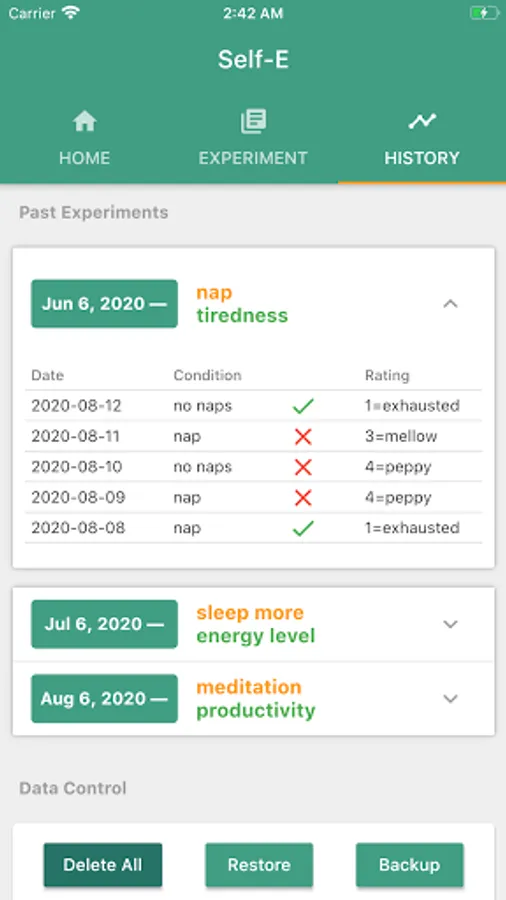 Through Self-E, you can set up experiments, view your data, and attain individualized insights through automated statistical analysis. Self-E sends daily reminders to check in so that your experiment stays consistent and structured.