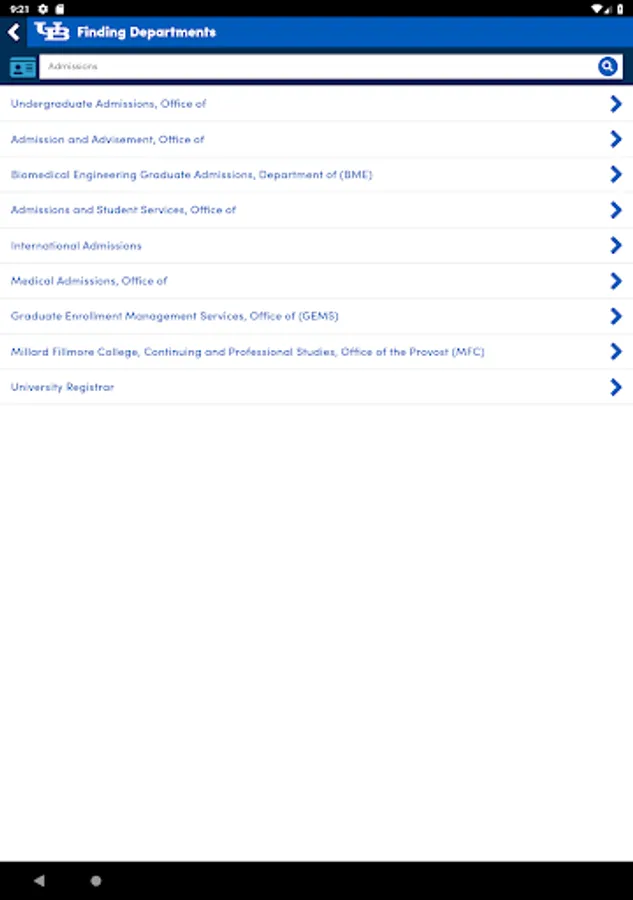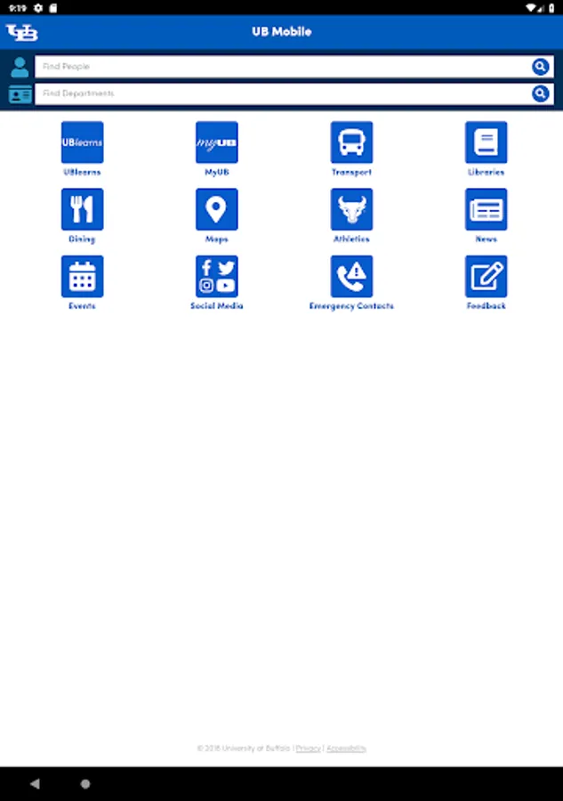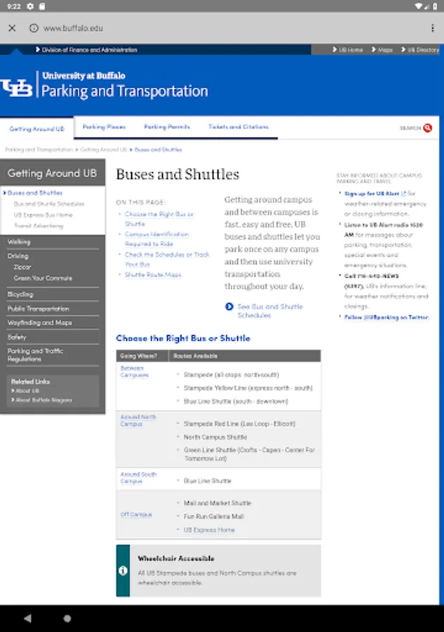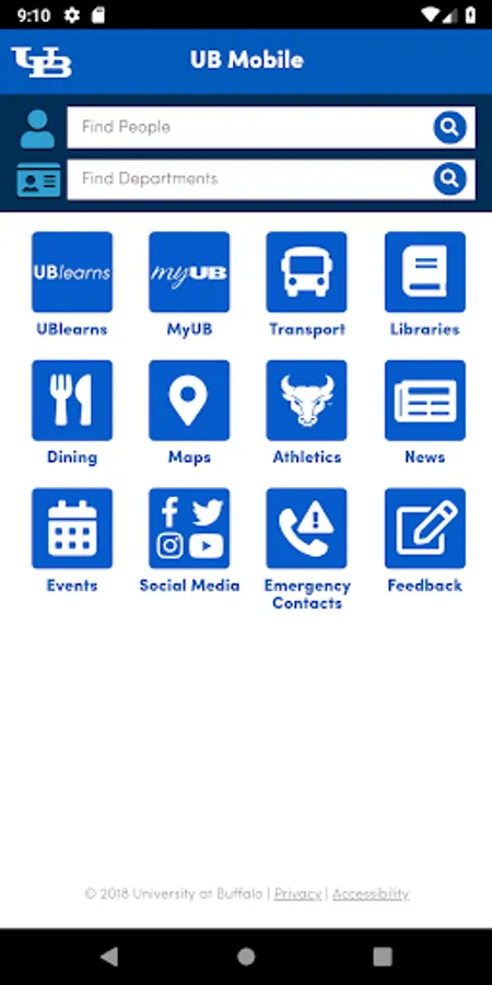 It’s UB at your fingertips. Search UB, find people and departments, access MyUB, manage courses, get the latest UB news, event listings and Bulls scores, along with access to library resources, campus maps and transportation information, including bus and shuttle schedules and parking details.