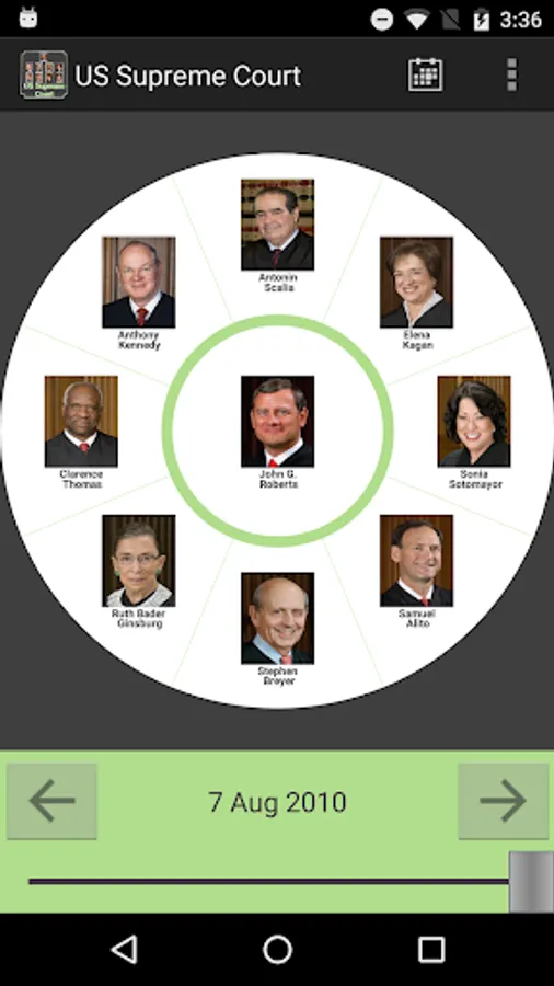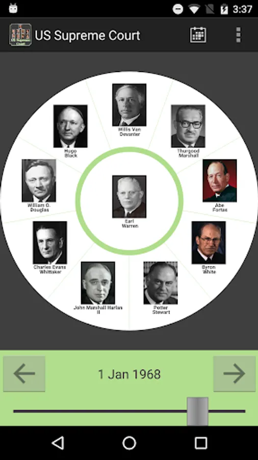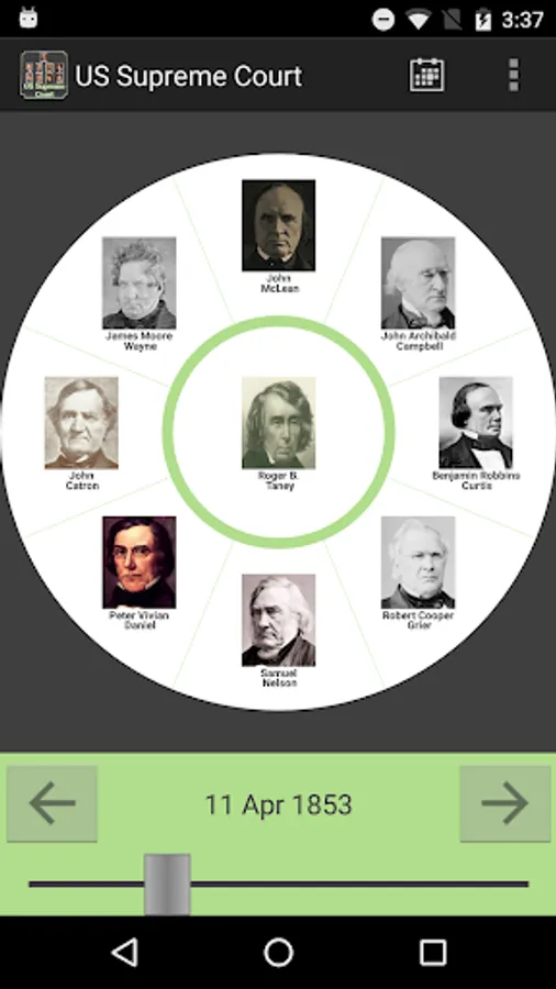 Drag the slider from 1789 to the present day to see who the Justices were in that year. Or just spin the wheel and see what happens. Or for more precise control, tap the forwards and backwards buttons to see the exact dates specific Justices were appointed or retired. You can also select the calendar button in the toolbar to go to an exact date.