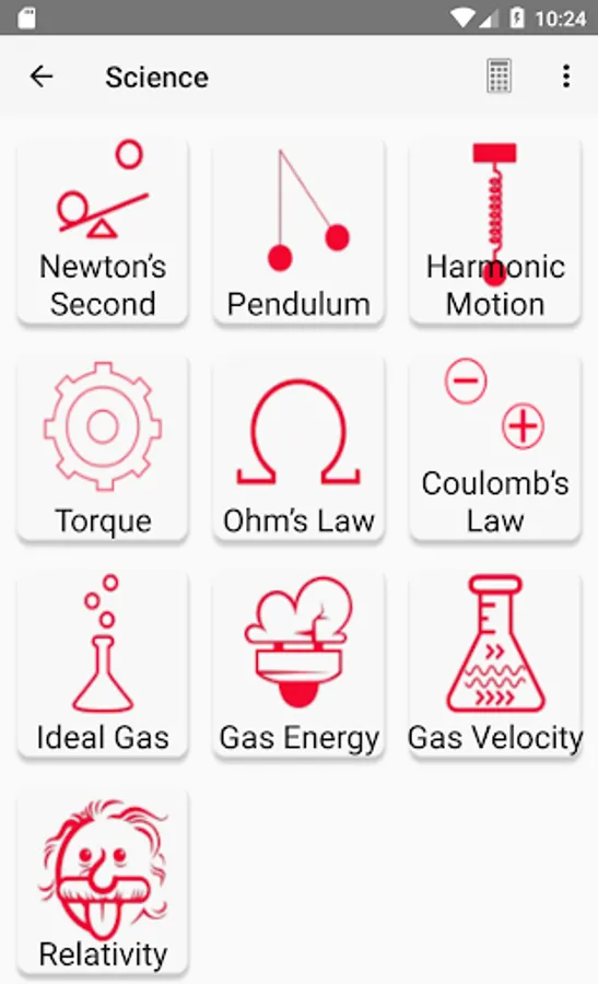 Science: Newton's second law, pendulum swing time, harmonic motion, torque, Ohm's law, Coulomb's law, ideal gas law, gas energy, gas velocity, mass energy equivalence