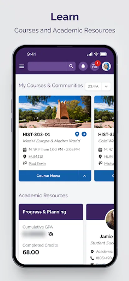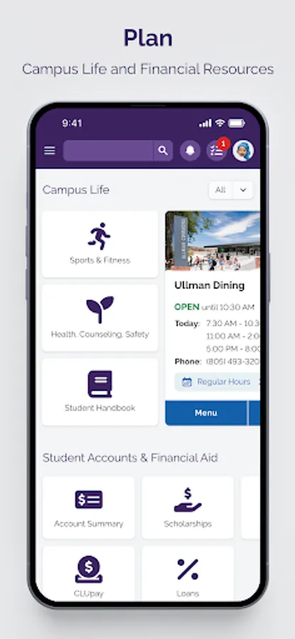 MyCLU Mobile includes access to Colleague Self-Service processes, including final grades, financial aid, and student planning. Other resources include Blackboard course information, athletic schedules, scores, and news. An interactive campus map to the Thousand Oaks campus is provided as well as information about dining locations and other campus locations. A mobile message center includes timely notifications for important information.