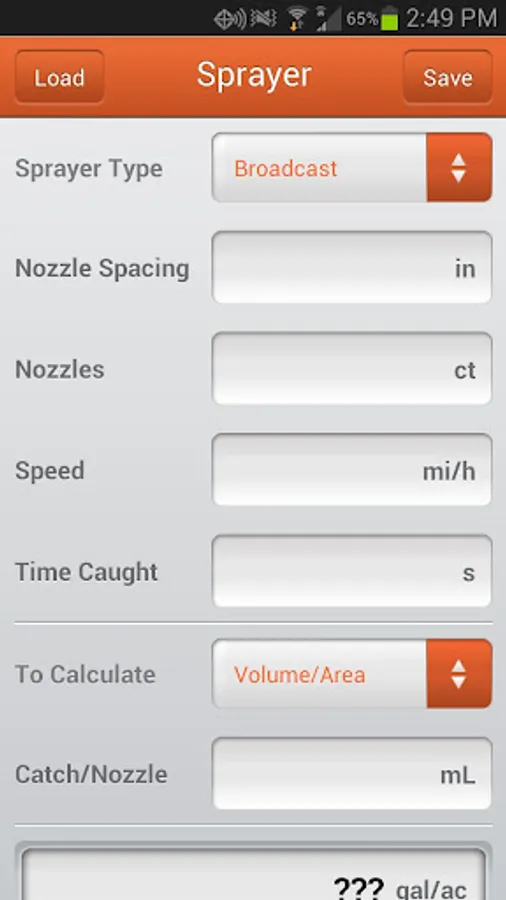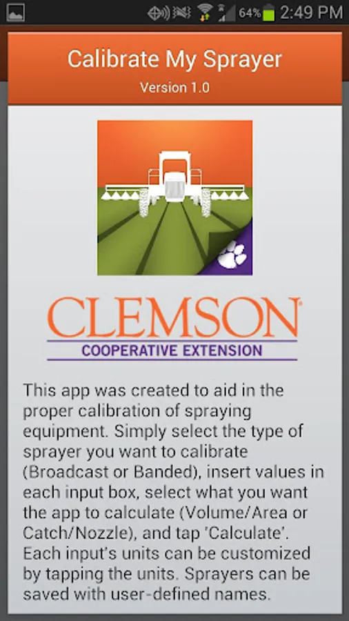 This app was created to aid in the proper calibration of spraying equipment. Simply select the type of sprayer you want to calibrate (Broadcast or Banded), insert values in each input box, select what you want the app to calculate (Volume/Area or Catch/Nozzle), and tap 'Calculate'. Each input's units can be customized by tapping the units. Sprayers can be saved with user-defined names.
