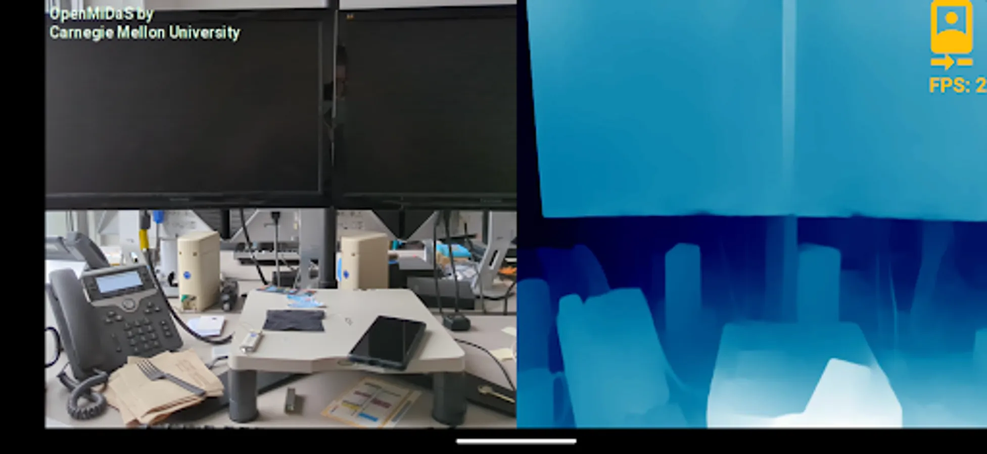 OpenMiDaS transmits a video stream from the device to a backend server where depth estimation is performed using MiDaS and returned to the device for a side by side comparison with the camera preview.