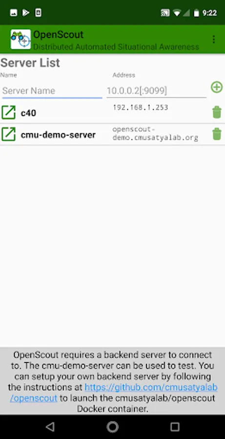 OpenScout requires a server running the backend application to connect with. The backend runs on a machine with a discrete GPU. Please see https://github.com/cmusatyalab/openscout for instructions on how to setup the server.