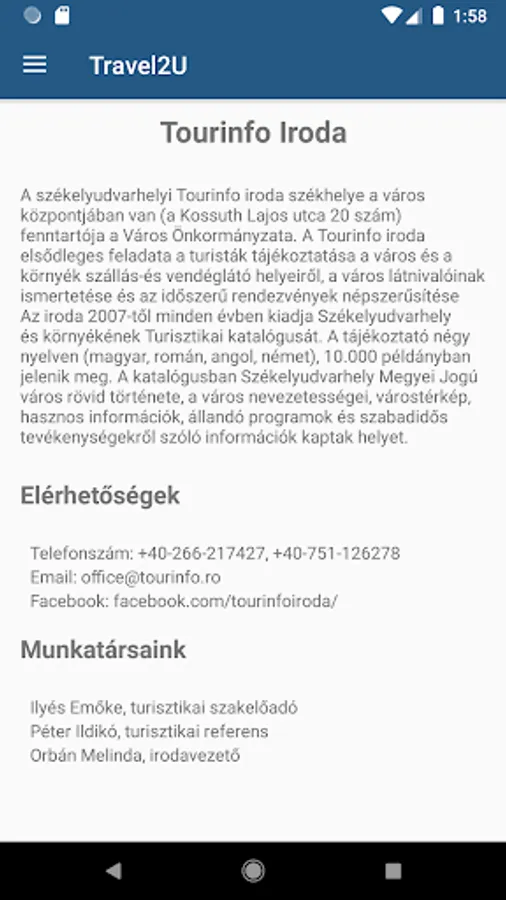 The touristic mobile application designed for Székelyudvarhely can be handled easily; its use helps discover the town. In this mobile app serving as a tourist guide we can find the photos of the sights, accompanied by trilingual descriptions (HU, EN, RO). The uniqueness of the application is given by the sound-recordings which complete the sightseeing, making it more enjoyable and increasing the value of the app. The application launched by the office of Tourinfo also contains a map, which is a great help in orientation. The application can be found on the following websites: www.tourinfo.ro, www.visitodorhei.ro, www.visitinodorhei.ro , www.iranyudvarhely.ro.
