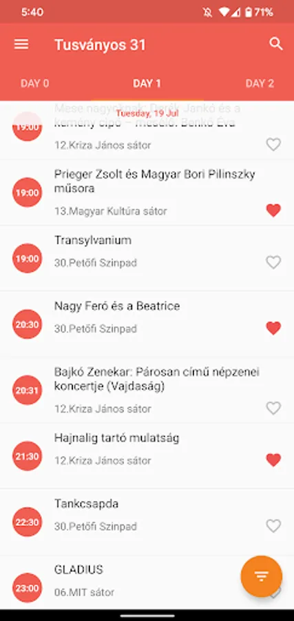 Browse among the events of Tusványos, search by artists, filter by categories, mark events as favorite or find out the exact location of featured events.