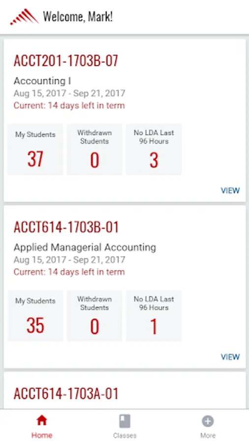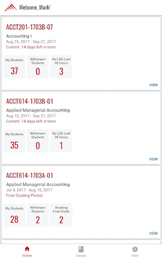 - A homepage that provides essential information regarding each course, such as number of students registered, and number of students who have not updated their LDA in 96 or more hours