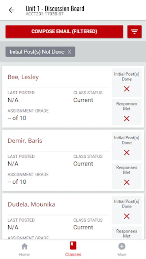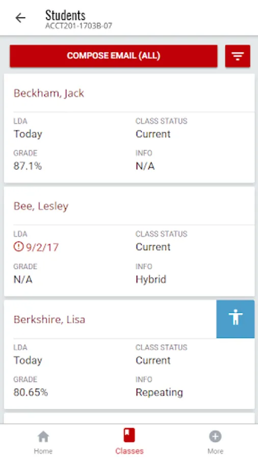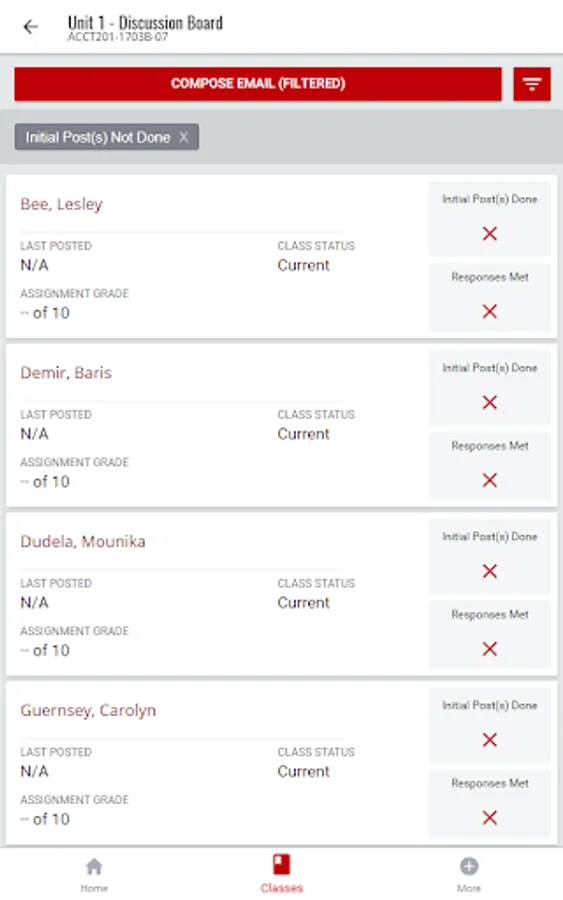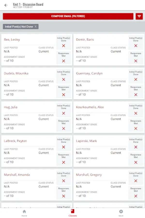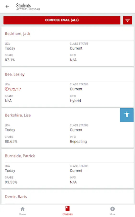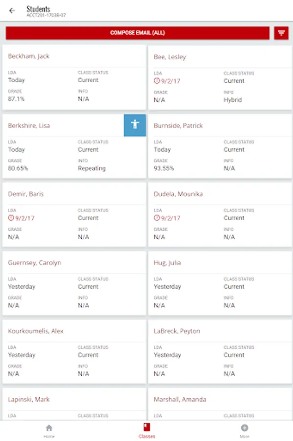 - Messaging capabilities, including options to message the entire roster, filtered groups of students, or a single student depending on need.
