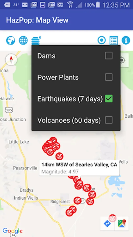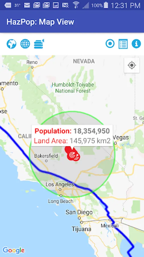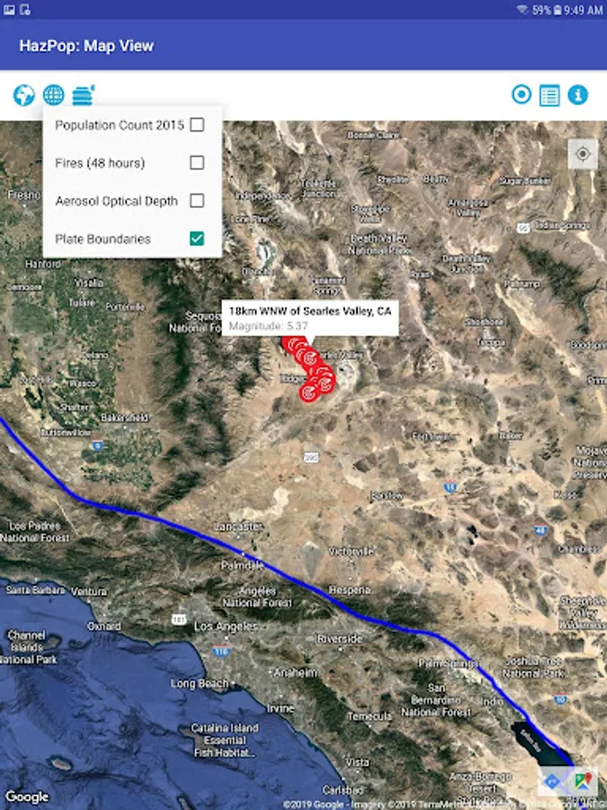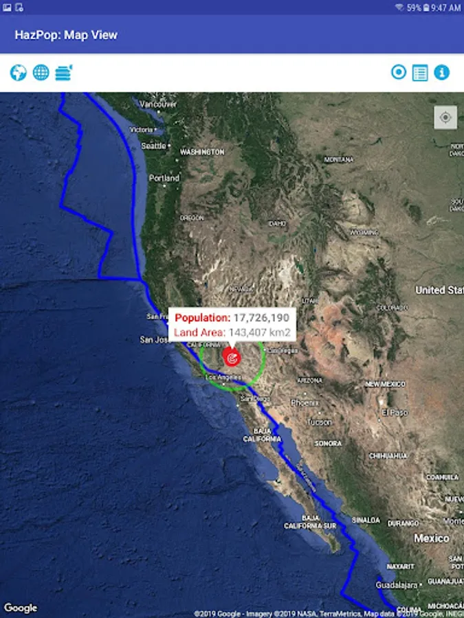 Hazards and Population Mapper (HazPop) is a free app that enables users to easily display recent natural hazard data in relationship to population, major infrastructure, and satellite imagery. Hazards data include the location of active fires over the past 48 hours; earthquake alerts over the past seven days; and yesterday′s air pollution data measured from space. The app shows the location of major dams and nuclear power plants and provides more detailed information and imagery for these facilities where available. By drawing a circle around a point or area of interest on the map, users can obtain an estimate of the total population and land area enclosed within.