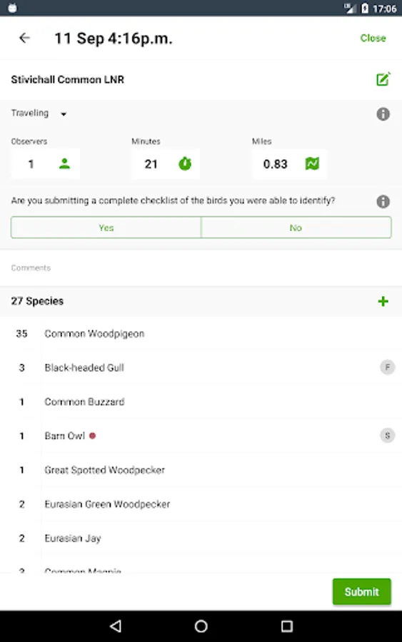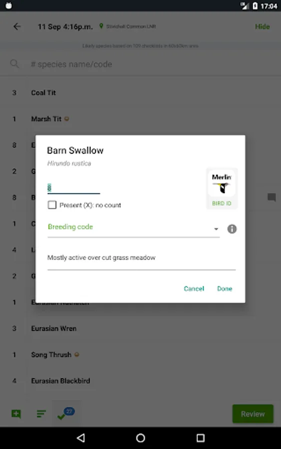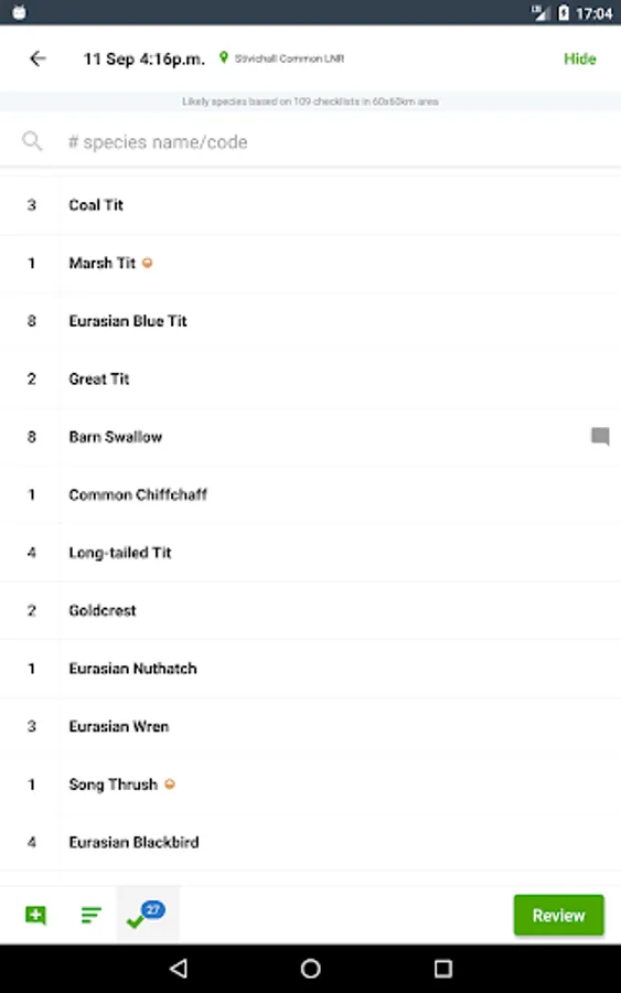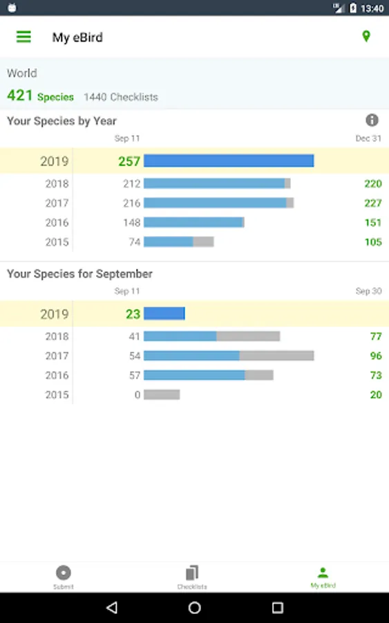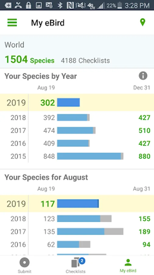 - Checklists customized for your location and time of year, showing most likely species based on eBird data.