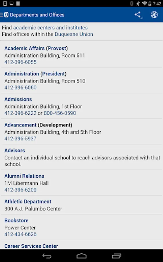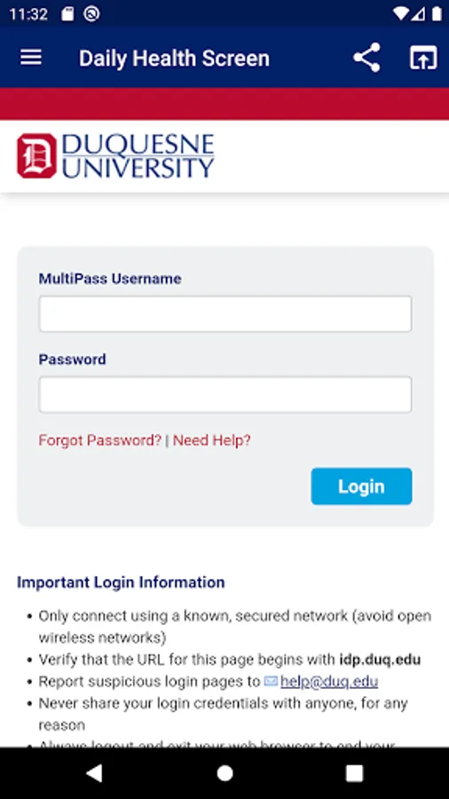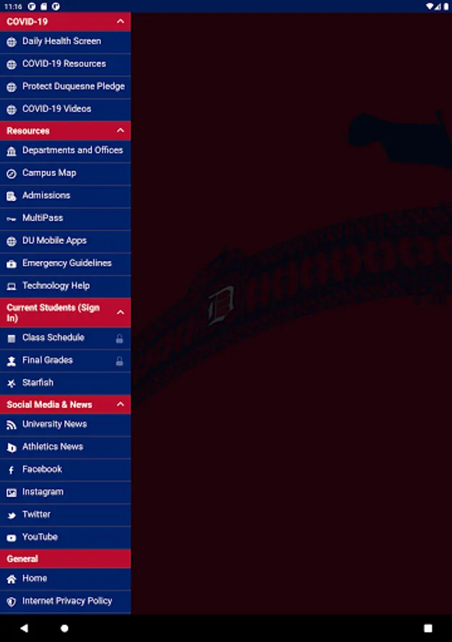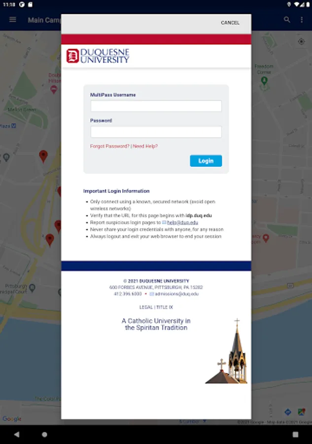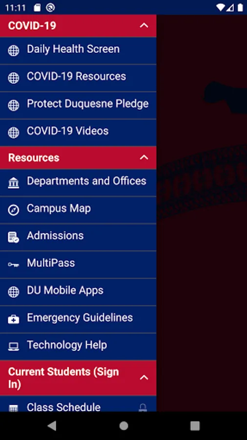 Stay connected to Duquesne with access to news, the University’s social media channels, Athletics news, a directory of departments and offices on campus, a faculty, staff and student directory, the campus map and more. Students can access a course list and their grades via MultiPass.