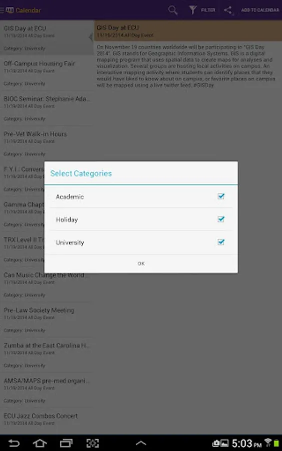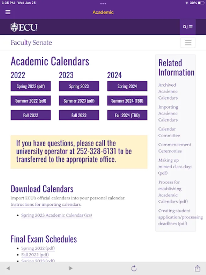 Calendar: Find and keep track of a wide range of East Carolina University activities, from concerts and art exhibits to lectures and athletics. View the academic calendar for the current semester and the holiday calendar for the year.