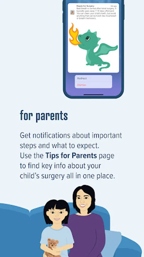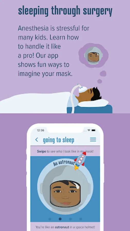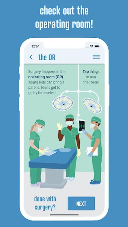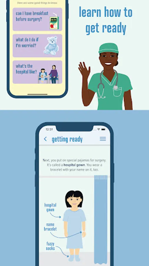 The app uses kid-friendly language, animations, and analogies to help you and your family learn about surgery. You’ll learn about reasons for tonsillectomy, what to do before surgery, anesthesia, and recovery at home. The app suggests good ways to feel less nervous. It also has information for parents, plus reminder notifications about important steps to take and normal symptoms to expect.