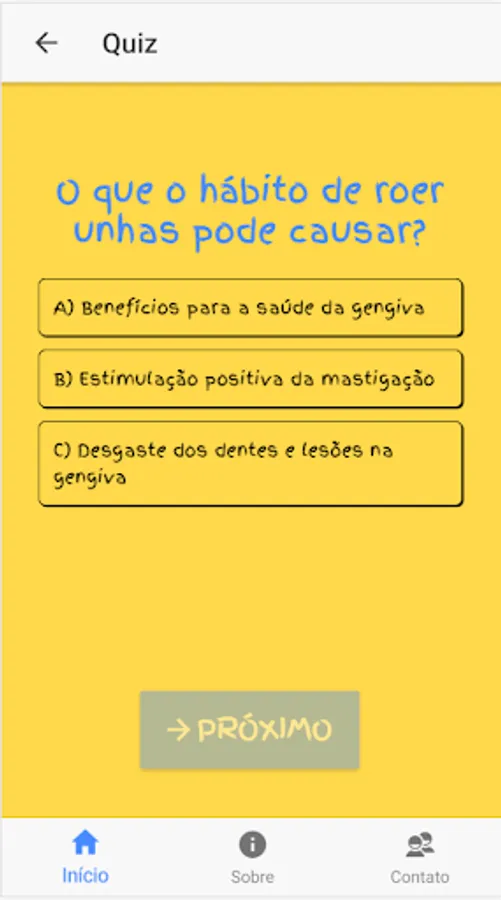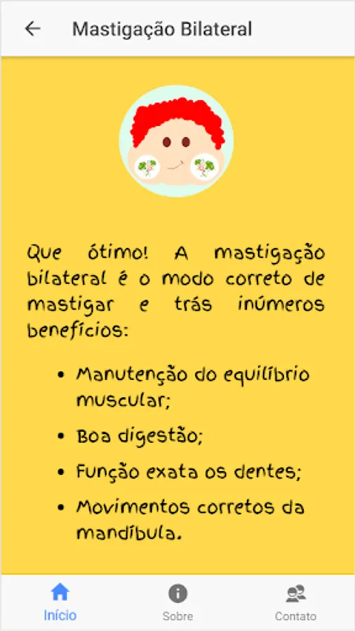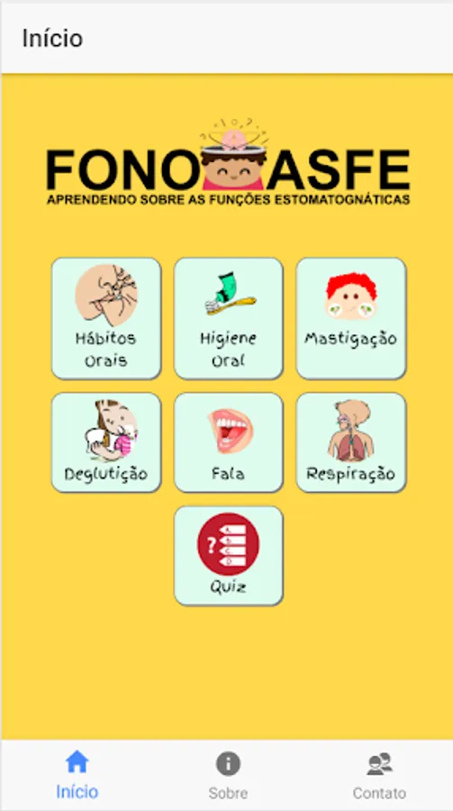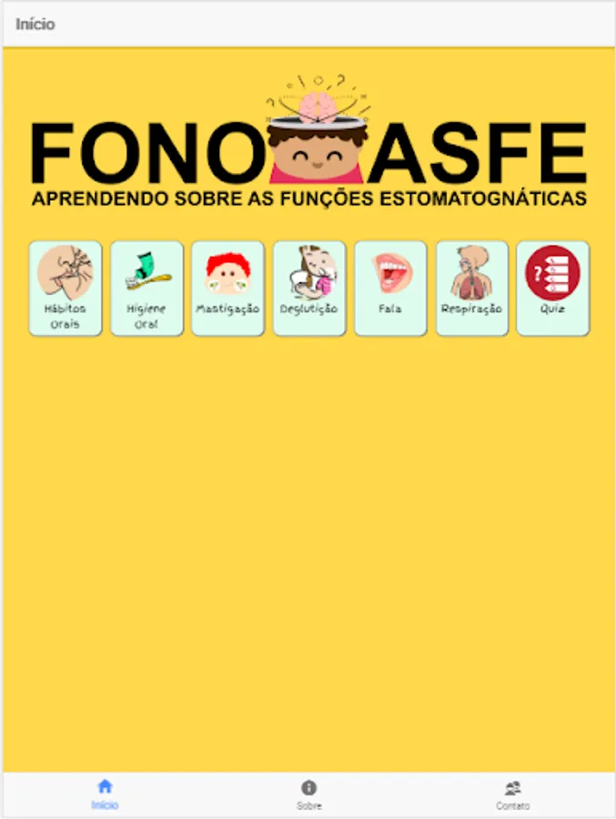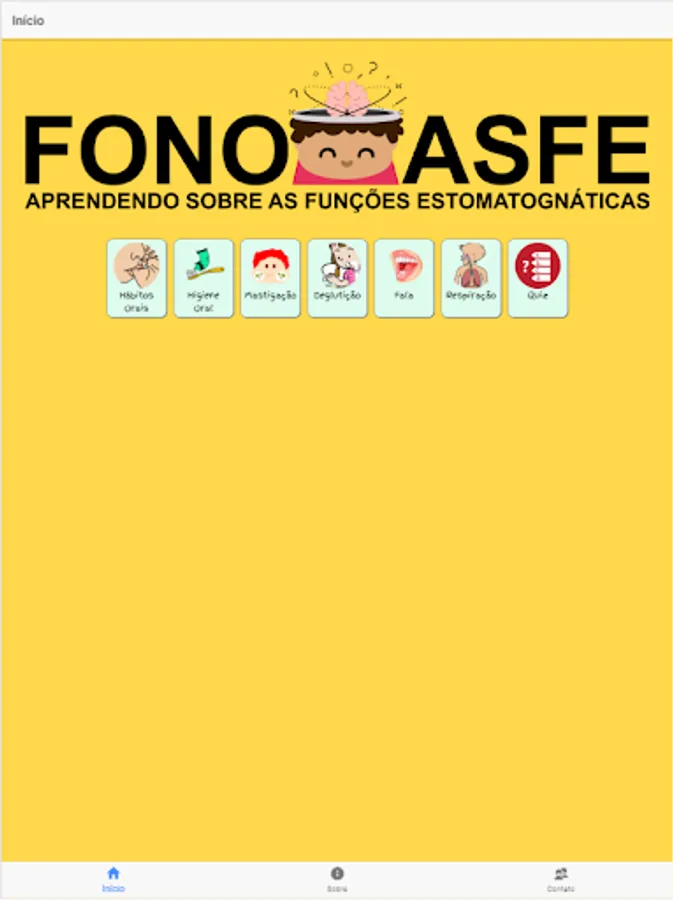 The application was designed to assist the audiologist in the orofacial motricity of children, allowing them to learn about the physiology of the stomatognathic functions and recognize what is right and what is not appropriate in the performance of funções.Além this, the child will also know a little about oral hygiene, oral habits and have the opportunity to reaffirm what you have learned with a Quiz.