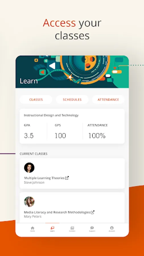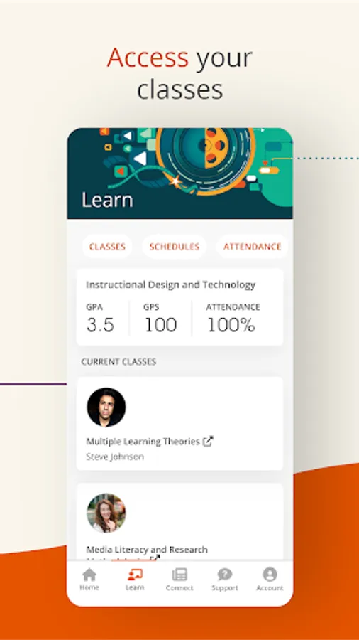 - access your classes, schedules, and grades to stay on top of your coursework and progress