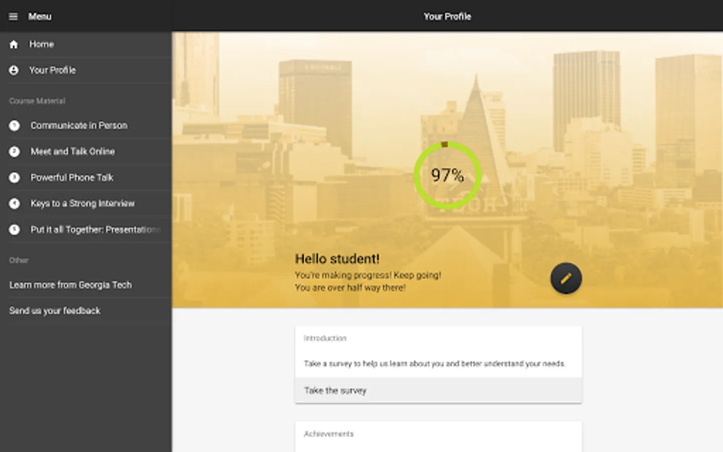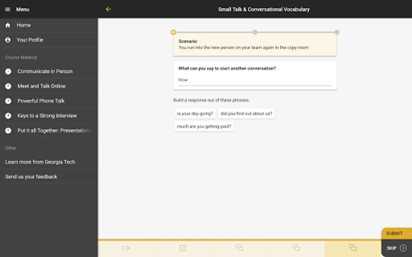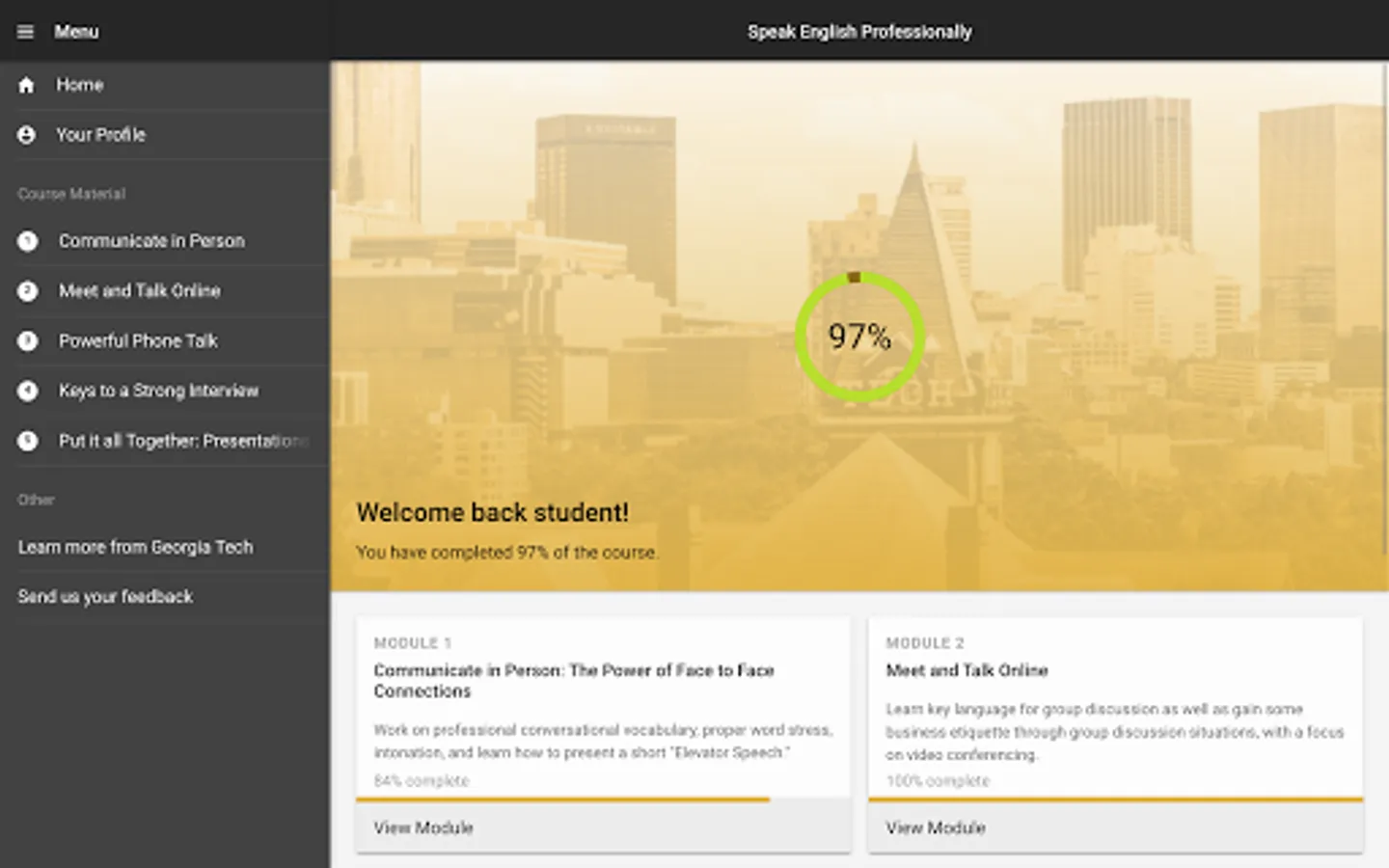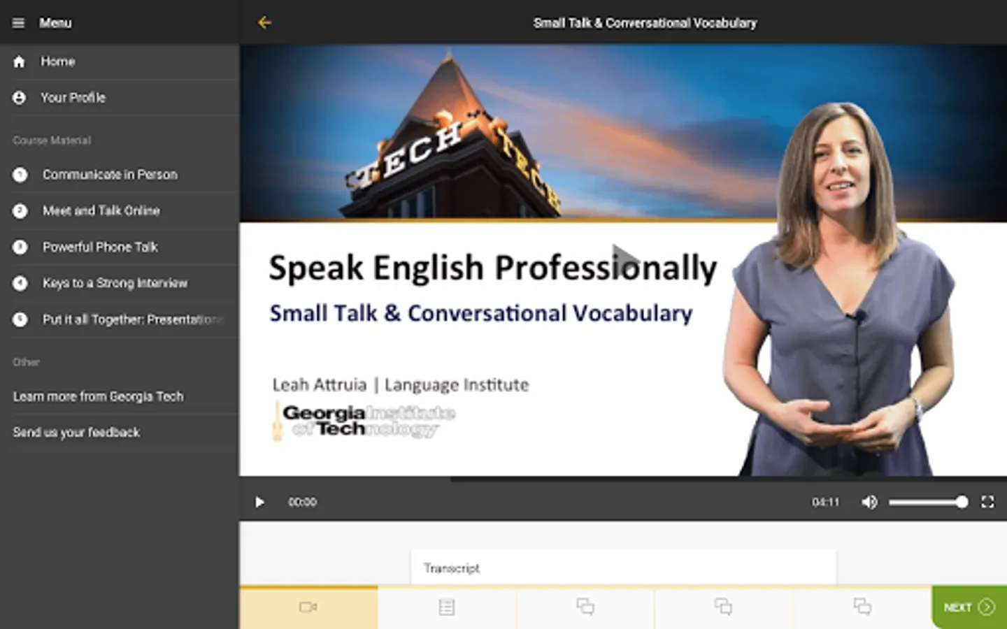 Do you want to improve your spoken English? This Georgia Tech Language Institute course app will help you reach that goal through a combination of lectures, comprehension and vocabulary quizzes, practice, and performance. You’ll gain the skills and confidence to communicate well in English, anywhere in the world.