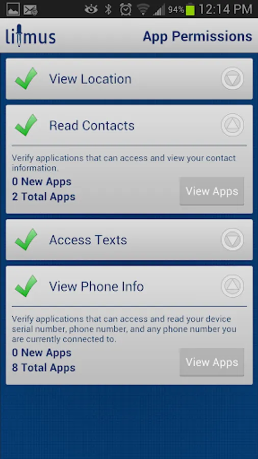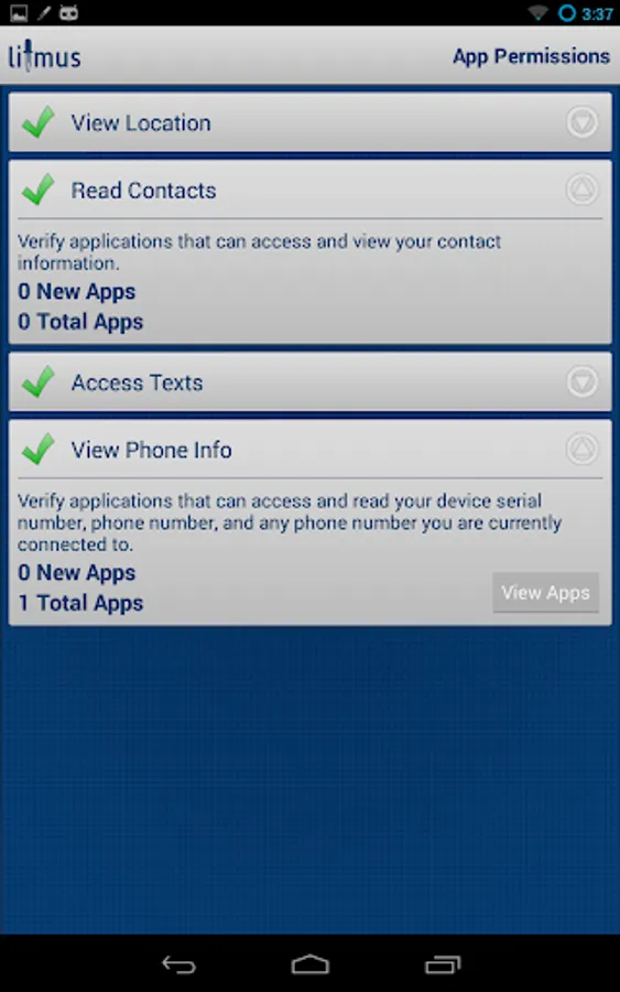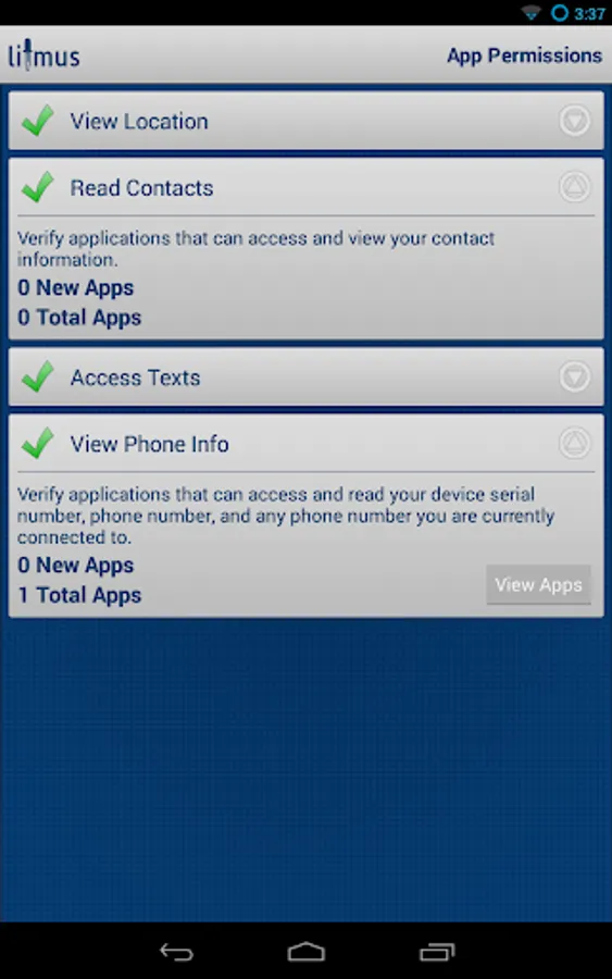 • App Permissions – as you install application Litmus will alert you to verify that you review the permissions for the new apps especially your location, contacts, text messaging, and your phones administrative information