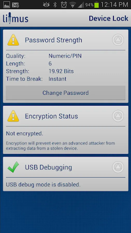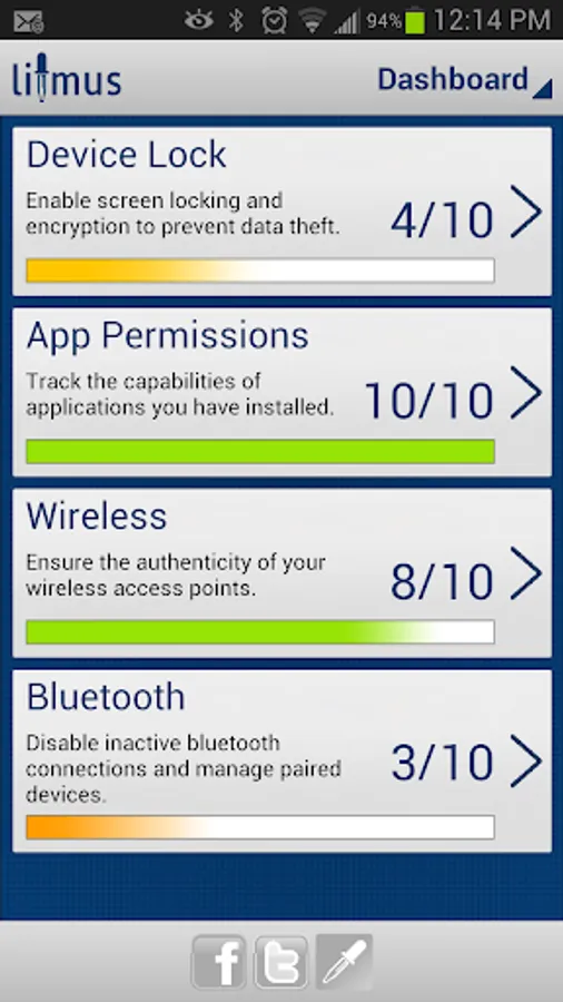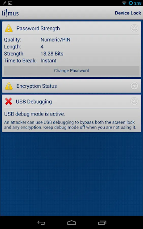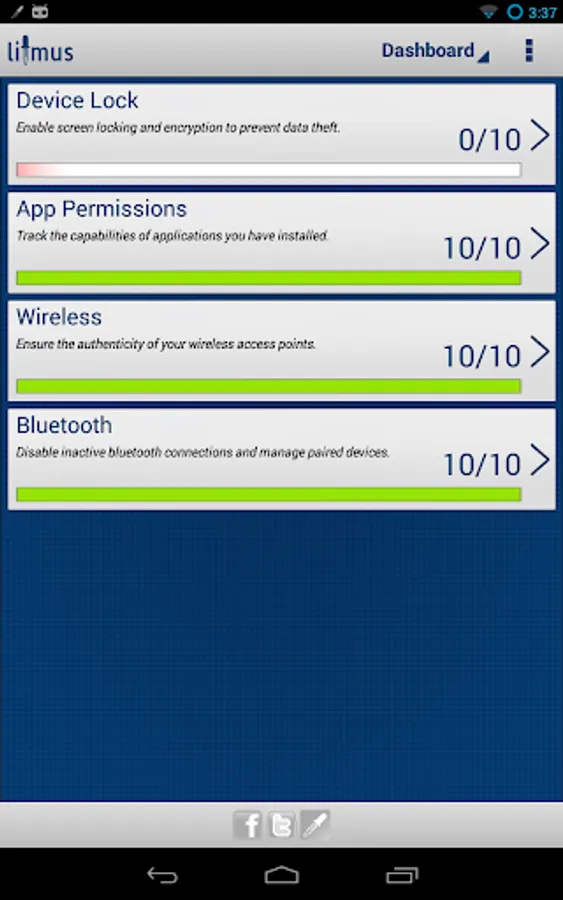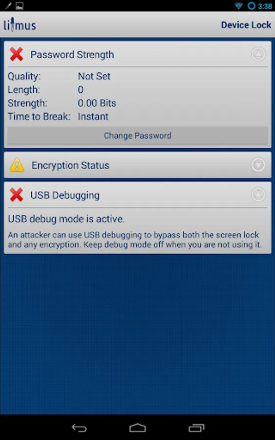 Litmus monitors your device locking, encryption status, usb vulnerability, which app permissions, the security of each wifi hotspot you encounter, and Bluetooth security.