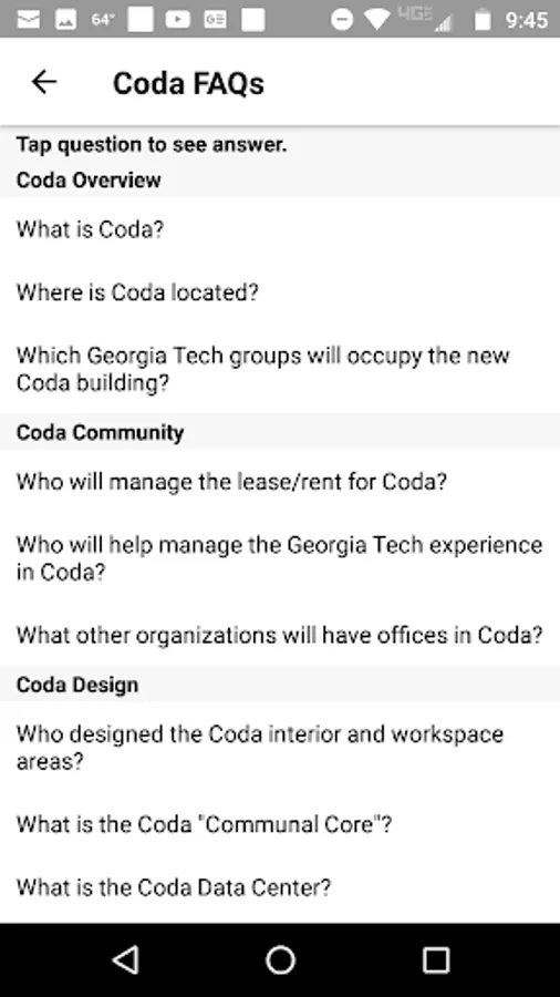 The GT@Coda App provides a portal for information on the Coda building conveniently located in one place. Access to public transportation, weather, safety, floor plans, and more!