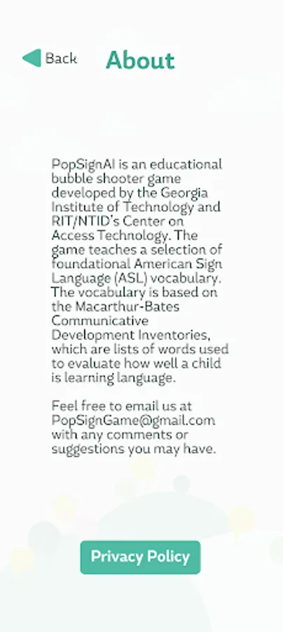 PopSignAI is a "bubble shooter" game where the player tries to match three or more bubbles of the same type to burst them. PopsignAI uses a smartphone's selfie camera to recognize the player signing one of five signs while they aim at the bubbles they want to shoot. More levels will be added as the recognition system is incorporated.