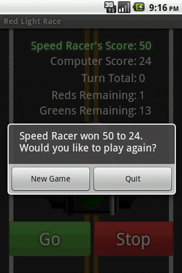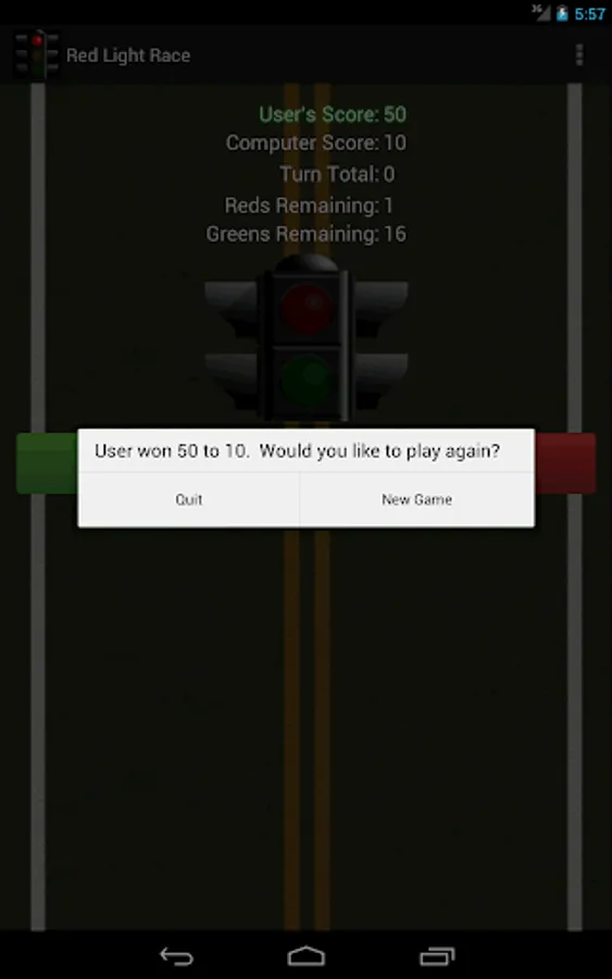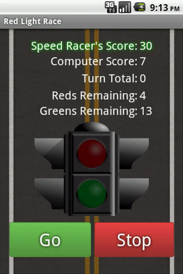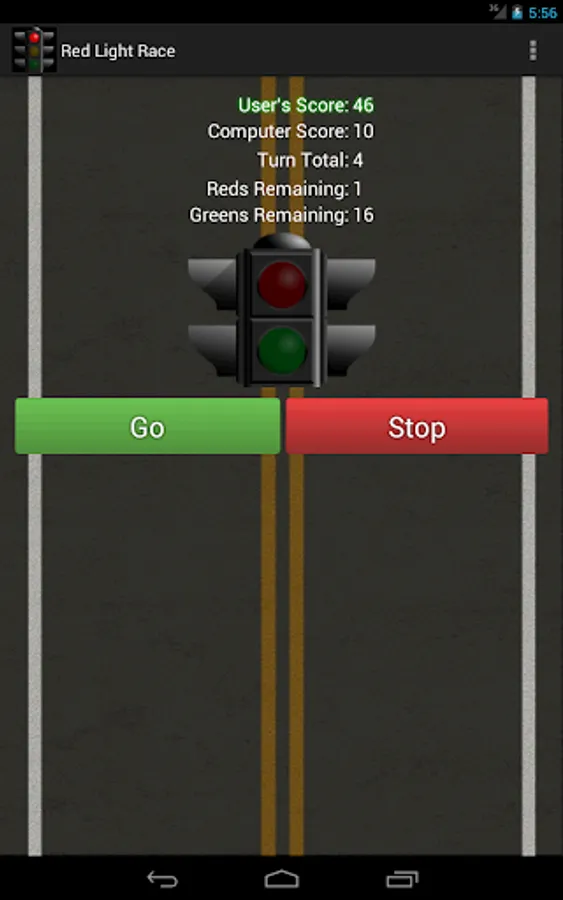 The game of Red Light is a very simple jeopardy game in which two players race to reach 50 points. In a bag, 4 red and 24 green chips ("lights") are shuffled. Each turn, a player repeatedly draws chips until either a "red light" is drawn or the player holds and scores the number of "green lights" drawn (i.e. the turn total). At any time during a player's turn, the player is faced with two decisions: