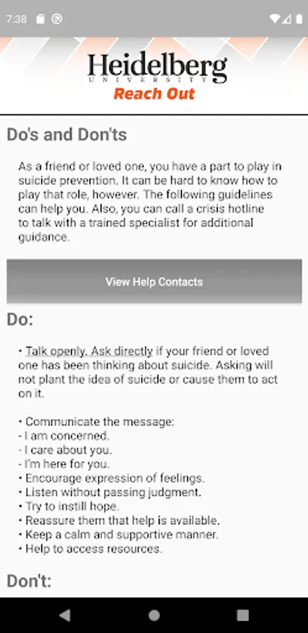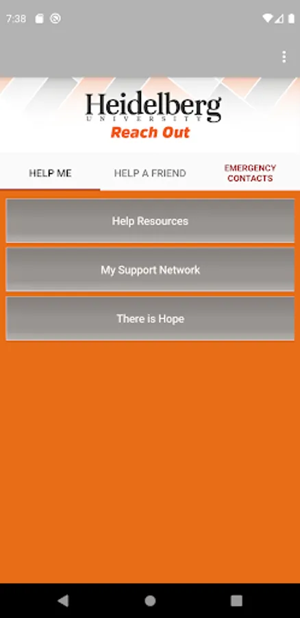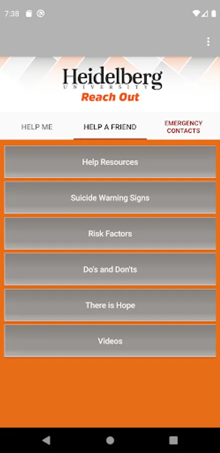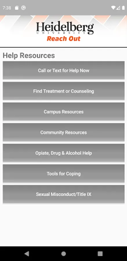 Heidelberg University's Reach Out app provides quick access to guidance for supporting a friend in need, suicide prevention, or coping with mental health challenges. It also supplies information about resources, referrals, and counseling services offered on the campus and in the community, including crisis hotline numbers. The Reach Out app is designed for students, parents, friends of students, faculty, and staff of Heidelberg University, located in Tiffin, Seneca County, Ohio. The Reach Out app better prepares people to help a friend, loved one or themselves.