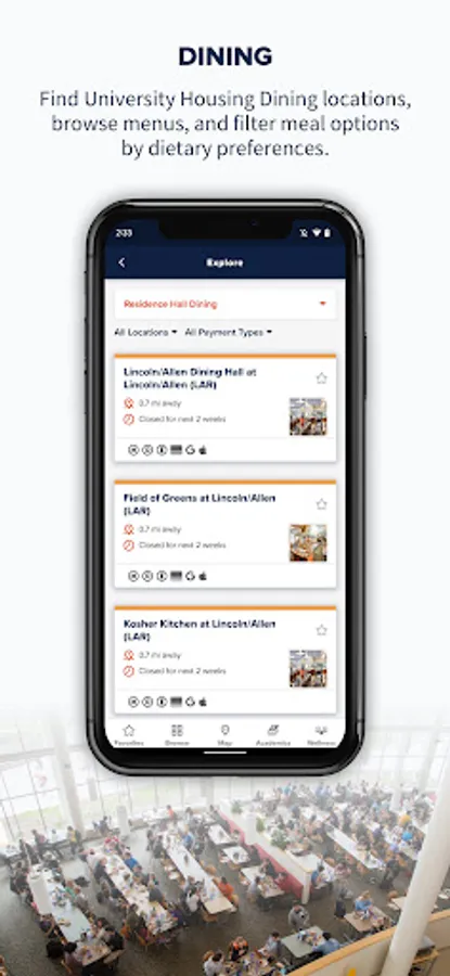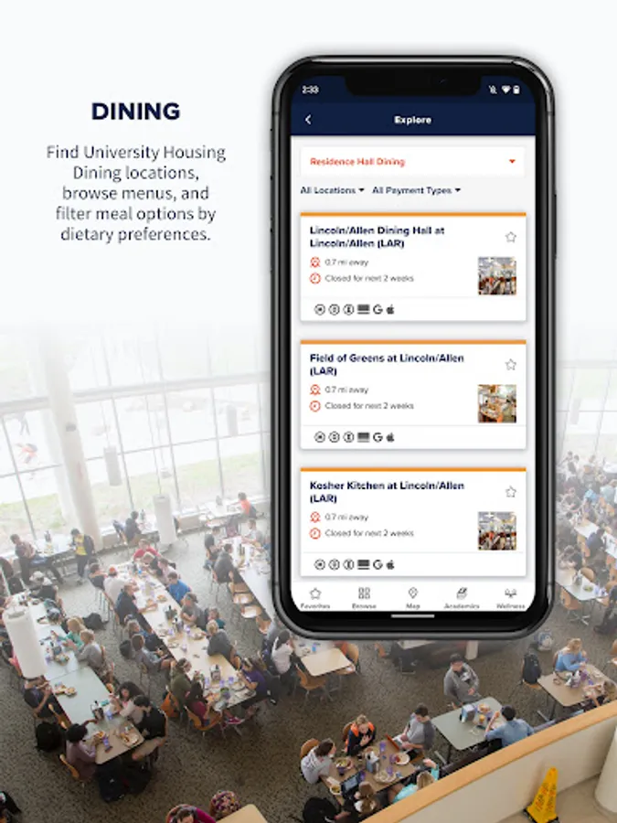 • Residence hall dining menus filtered by your food preferences — anyone with Illini Cash or a meal plan can dine with University Housing