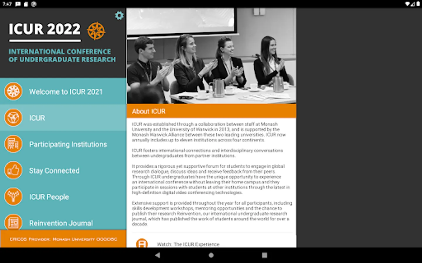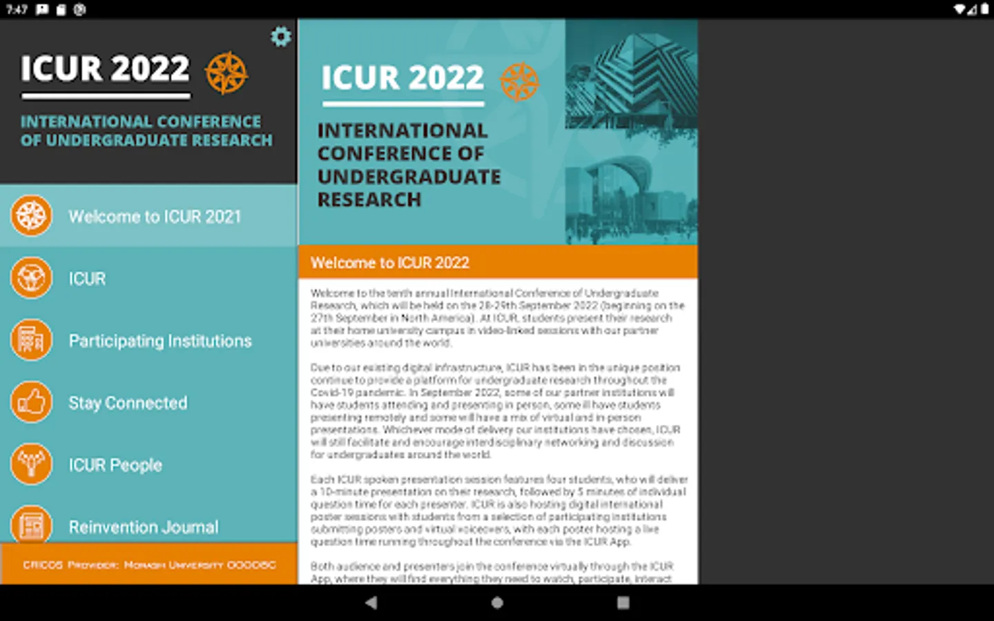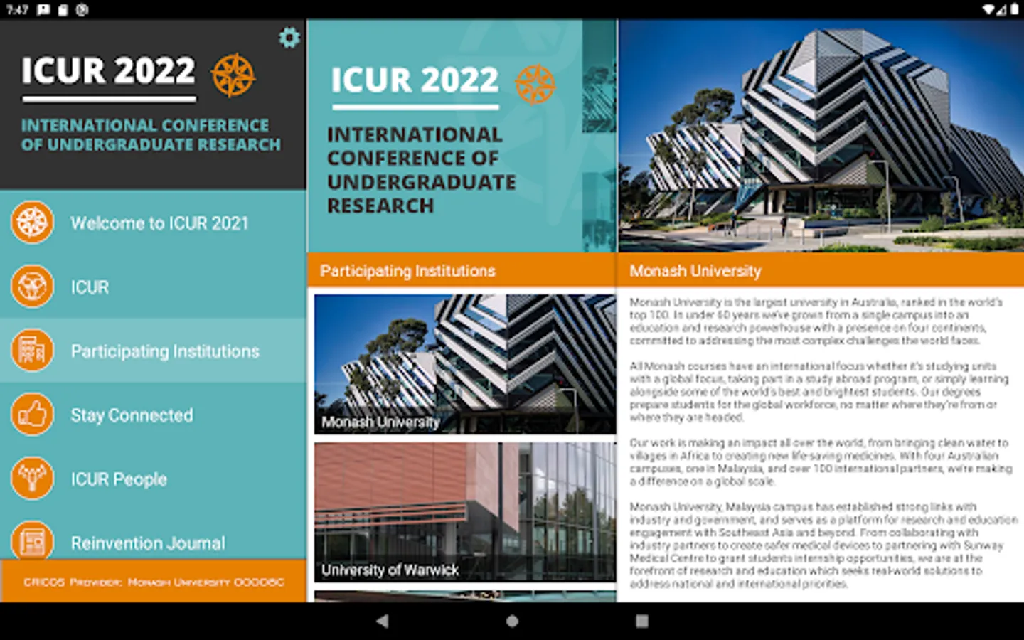 The official event app for the International Conference of Undergraduate Research. Supported by the Monash Warwick Alliance.