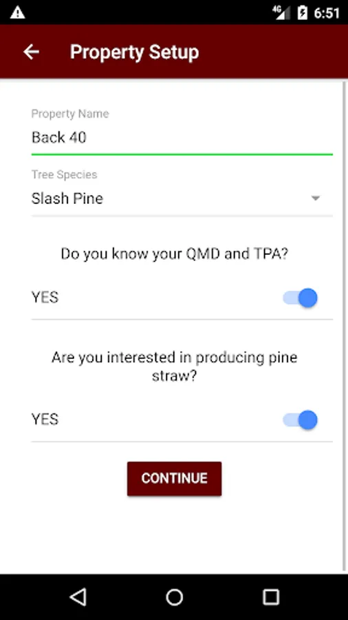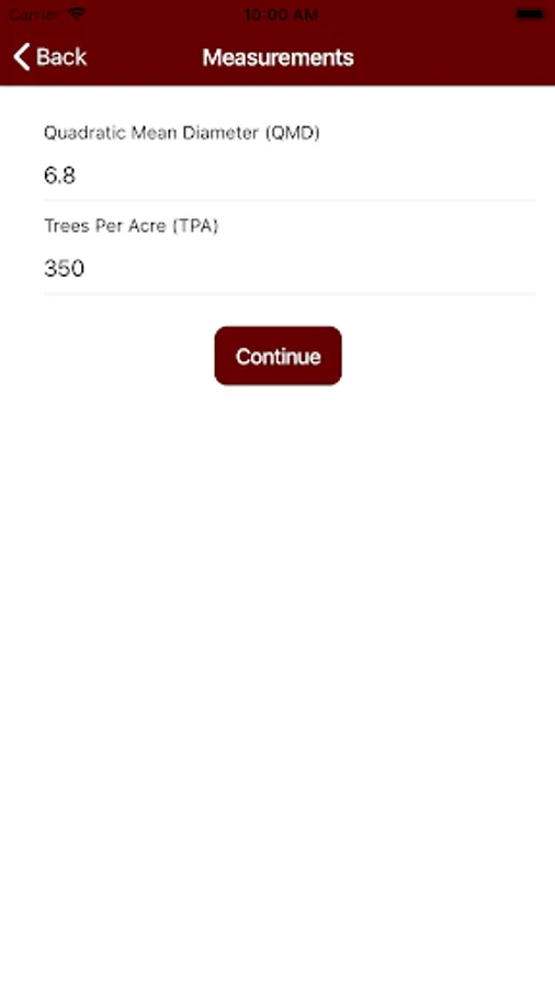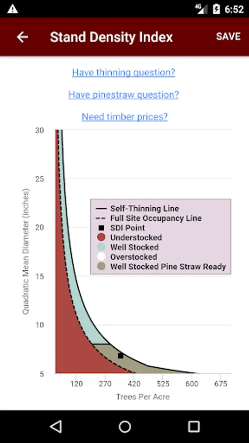 Stand Density Index (SDI) is used to help determine if a pine planation needs thinning. Pine Thin uses the average number of trees per acre and the average diameter at breast height (DBH) of trees in your plantation to determine if a thinning is needed. Specific density management diagrams have been developed for each of the four major southern pine species (loblolly pine, shortleaf pine, longleaf pine, and slash pine). Pine Thin provides a graphical depiction of the density of a pine plantation indicating if the stand needs thinning (i.e., overstocked) or if thinning is not yet needed (i.e., well-stocked). The line between well stocked and understocked (full site occupancy line) is also provided as a target density for the residual stand that should be left after thinning. If average number of trees per acre and DBH are not known, Pine Thin also allows for the entry of plot data (either 1/10th or 1/100th acre) and will then compute tress per acre, average diameter, and basal area.
